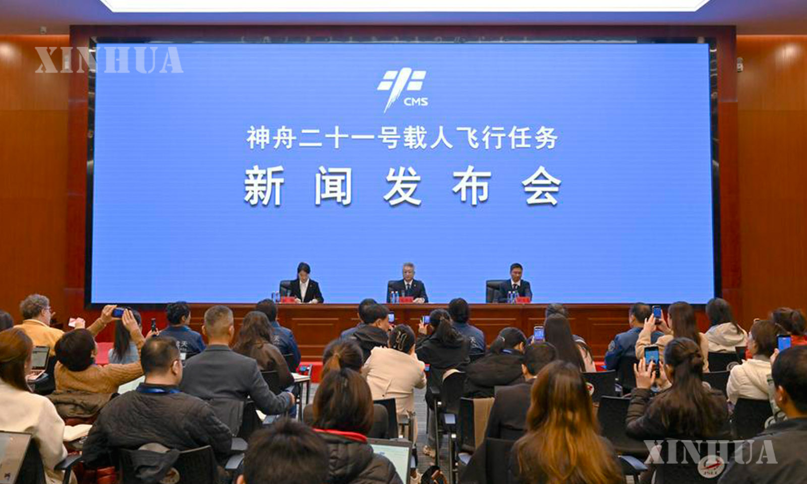 A press conference on the Shenzhou-21 crewed spaceflight mission is held in Jiuquan Satellite Launch Center in northwest China on Oct. 30, 2025. (Xinhua/Li Zhipeng)