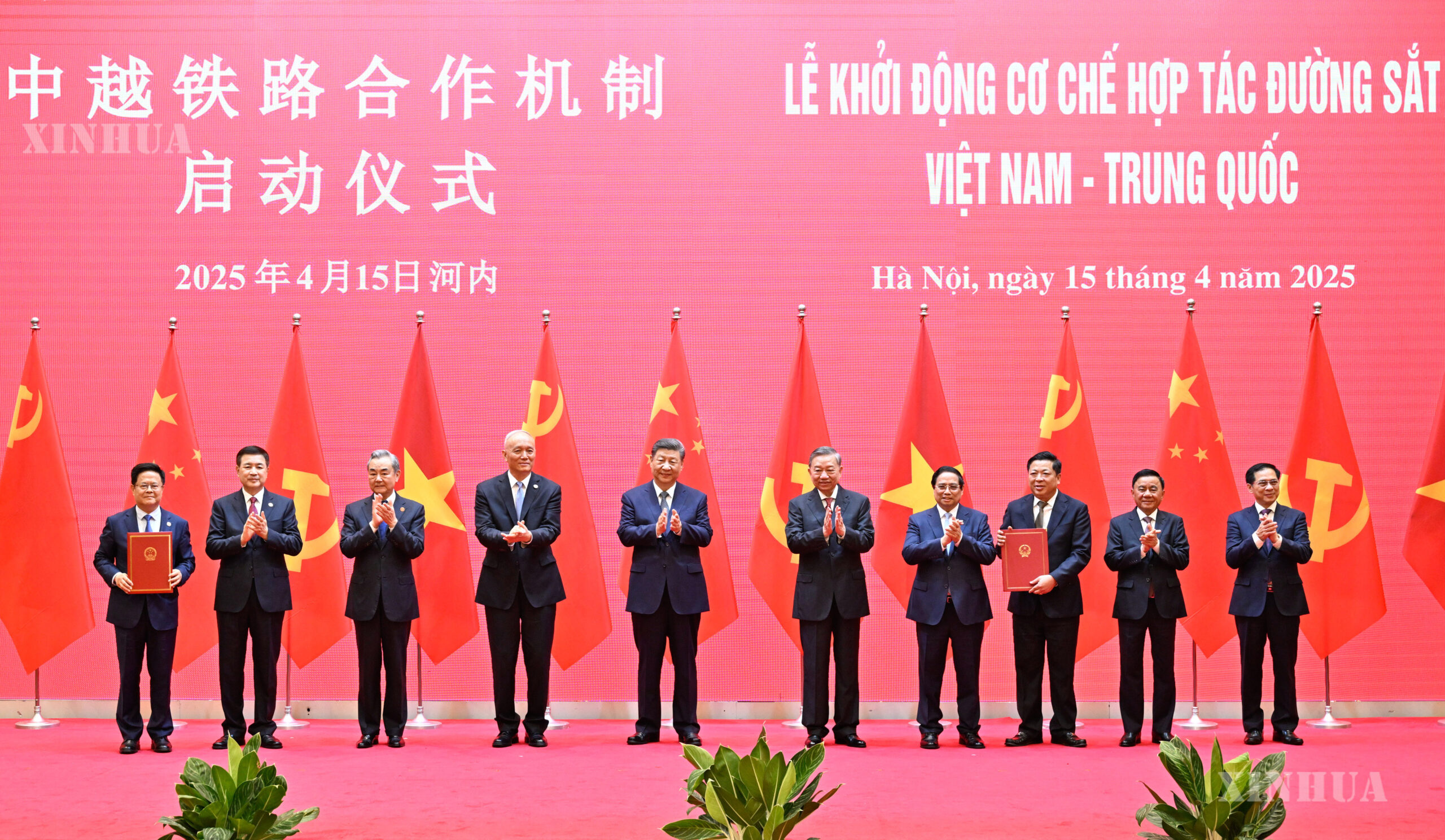 Photo 1: Chinese President Xi Jinping, also general secretary of the Communist Party of China (CPC) Central Committee, General Secretary of the Communist Party of Vietnam Central Committee To Lam and Vietnamese Prime Minister Pham Minh Chinh jointly witness the launching ceremony of the China-Vietnam railway cooperation mechanism at the International Convention Center in Hanoi, capital of Vietnam, April 15, 2025. (Xinhua/Yin Bogu)