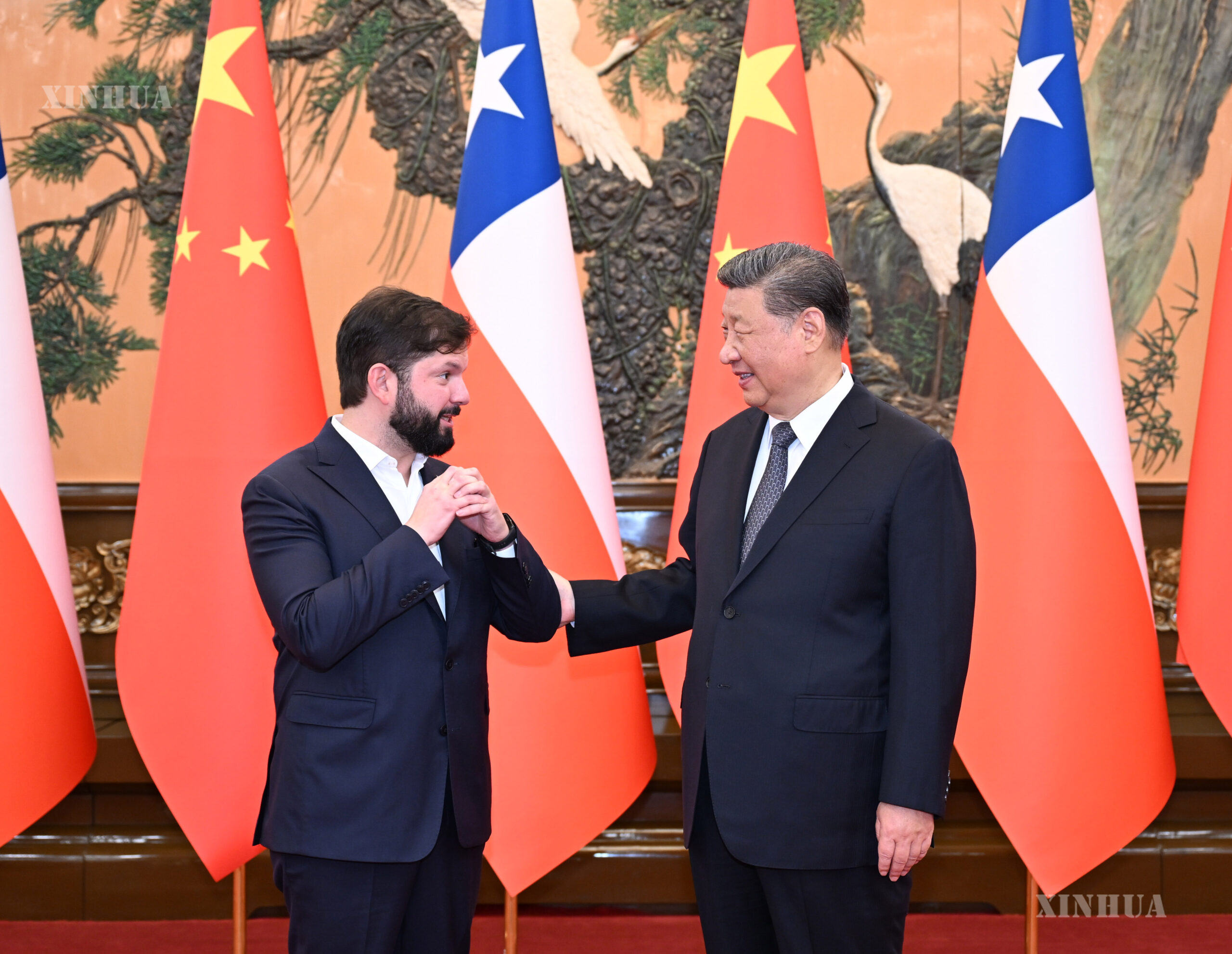 တရုတ်နိုင်ငံ မြို့တော်ပေကျင်းရှိ ပြည်သူ့ခန်းမဆောင်တွင် ချီလီသမ္မတ ဂါဘရီရယ် ဘောရစ်ခ်အား လက်ခံတွေ့ဆုံနေသည့် တရုတ်နိုင်ငံ သမ္မတ ရှီကျင့်ဖိန်အား ၂၀၂၅ ခုနှစ် မေ ၁၄ ရက်က တွေ့ရစဉ် (ဆင်ဟွာ)