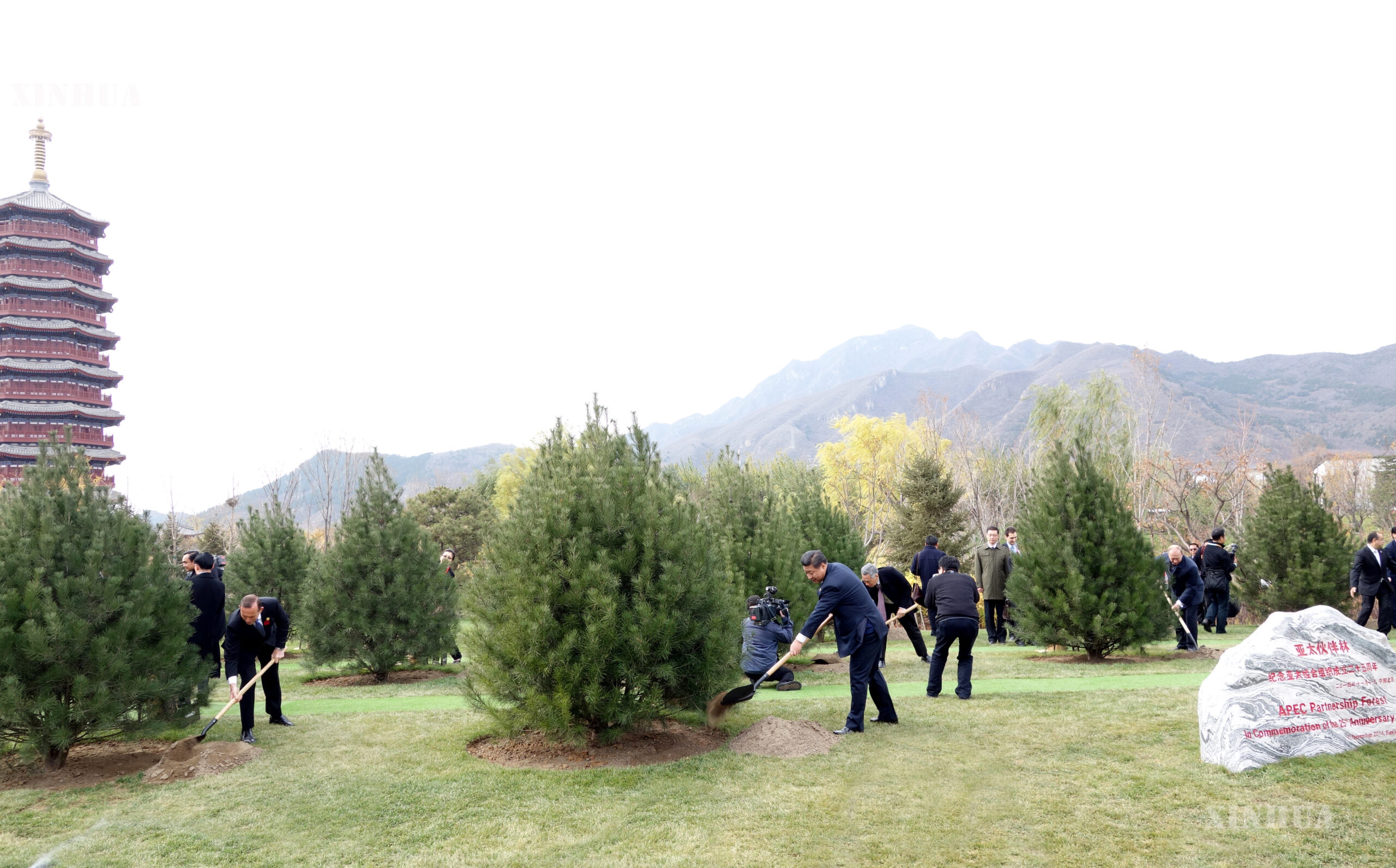 တရုတ်နိုင်ငံ မြို့တော်ပေကျင်း မြောက်ပိုင်းဆင်ခြေဖုံးဒေသရှိ Yanqi Lake နိုင်ငံတကာ ကွန်ဗင်းရှင်းစင်တာတွင် ပြုလုပ်သော ၂၂ ကြိမ်မြောက် APEC စီးပွားရေးခေါင်းဆောင်များ အစည်းအဝေးအတွင်း APEC မိသားစုအသိုက်အဝန်း ချစ်ကြည်ရေးအထိမ်းအမှတ်အဖြစ် အာရှ-ပစိဖိတ် စီးပွားရေးပူးပေါင်းဆောင်ရွက်မှု (APEC) အဖွဲ့ဝင်နိုင်ငံများမှ အခြားသော ခေါင်းဆောင်များ၊ ကိုယ်စားလှယ်များနှင့်အတူ သစ်ပင်စိုက်ပျိုးနေသည့် တရုတ်နိုင်ငံ သမ္မတ ရှီကျင့်ဖိန် (ယာ-ရှေ့) အား ၂၀၁၄ ခုနှစ် နိုဝင်ဘာ ၁၁ ရက်က တွေ့ရစဉ် (ဆင်ဟွာ)