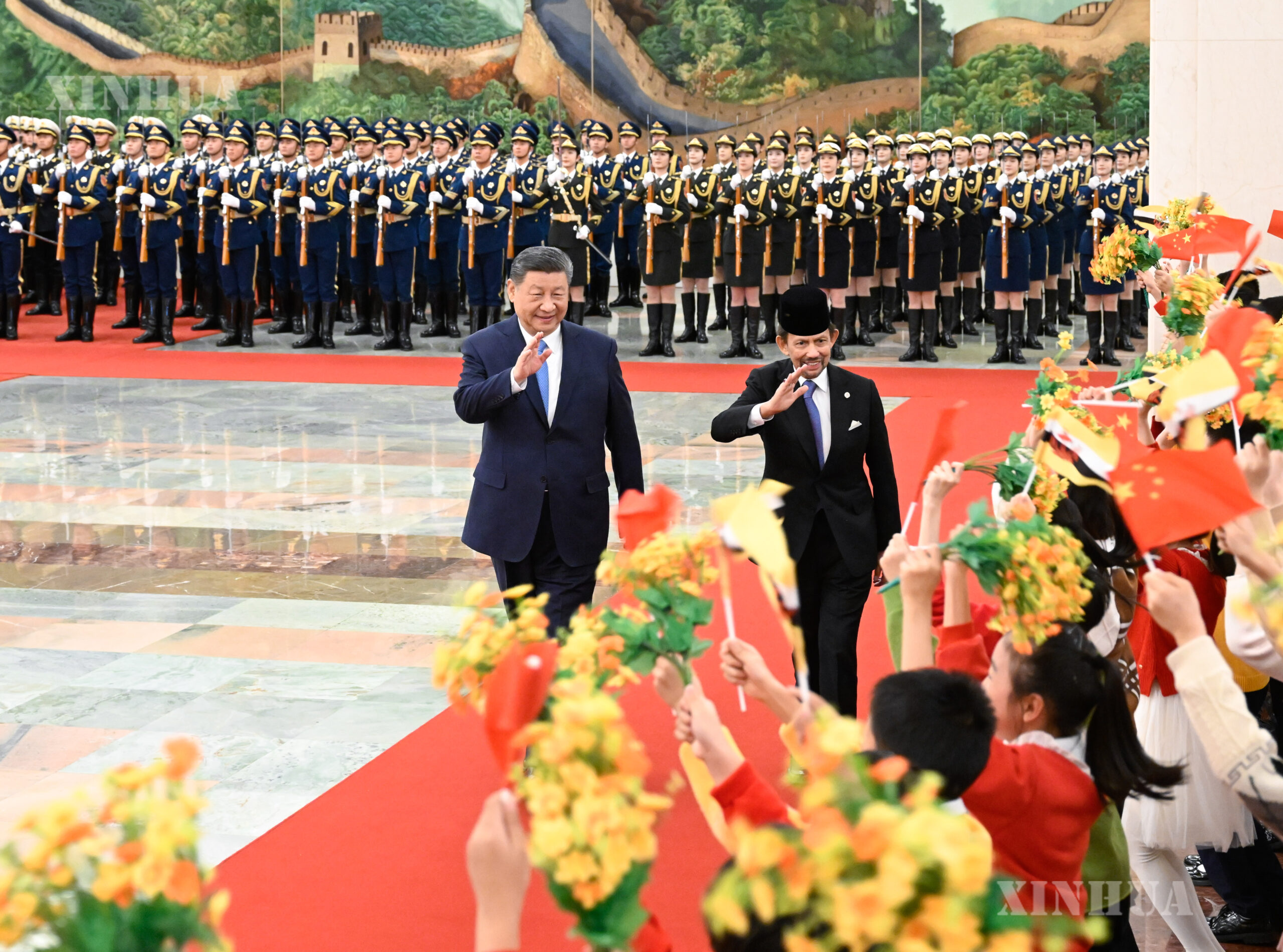 တရုတ်နိုင်ငံ မြို့တော်ပေကျင်းတွင် တွေ့ဆုံဆွေးနွေးမှုမတိုင်မီ ပြည်သူ့ခန်းမဆောင် မြောက်ဘက်ခန်းမ၌ ဘရူနိုင်းနိုင်ငံဘုရင် ဟာဂျီ ဟက်ဆန်နယ် ဘိုကီးယား မူအစ်ဇာဒင် ဝါဒါအူလာအား အခမ်းအနားဖြင့် ကြိုဆိုနေသော တရုတ်နိုင်ငံ သမ္မတ ရှီကျင့်ဖိန်အား ၂၀၂၅ ခုနှစ် ဖေဖော်ဝါရီ ၆ ရက်က တွေ့ရစဉ် (ဆင်ဟွာ)