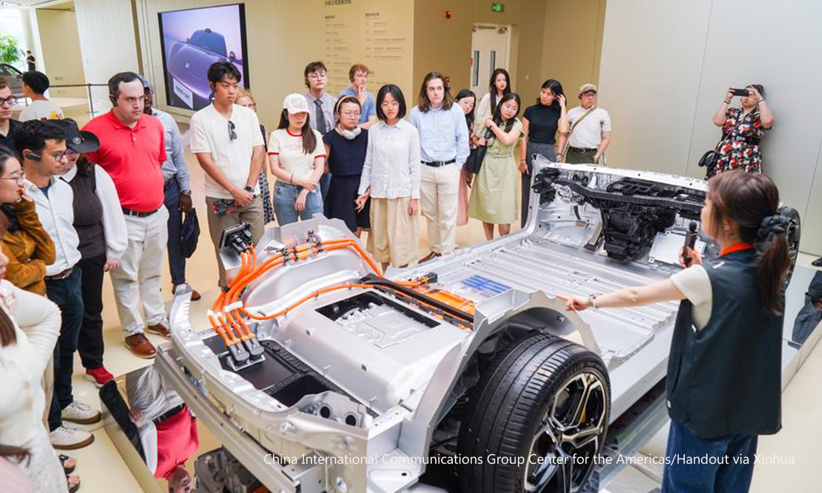 Chinese and American youth visit Xiaomi’s automobile factory in Beijing, capital of China, July 12, 2025. (China International Communications Group Center for the Americas/Handout via Xinhua)
