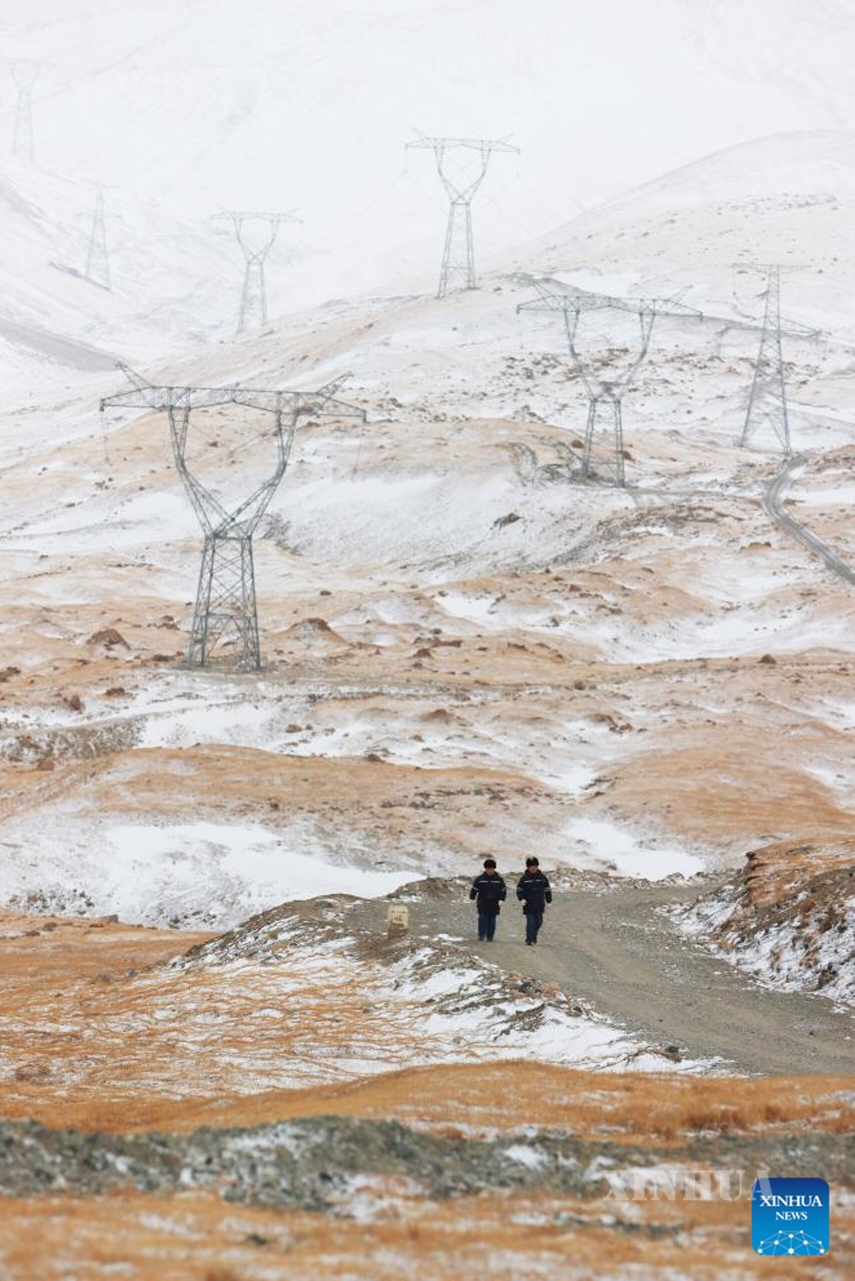 Photo (1) Staff members of a power company patrol along a 750-kilovolt (kV) power transmission line in Hejing County of Mongolian Autonomous Prefecture of Bayingolin, northwest China’s Xinjiang Uygur Autonomous Region, Oct. 2, 2025. (Photo by Zhang Limin/Xinhua)