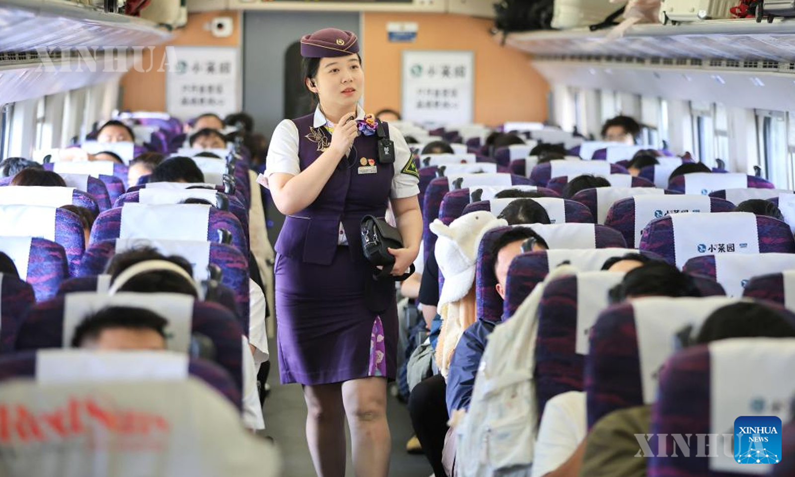 တရုတ်နိုင်ငံအရှေ့ပိုင်း ကျန်းဆူးပြည်နယ် ရထားတစ်စင်းပေါ်တွင် အလုပ်လုပ်နေသည့် ရထားဝန်ထမ်းတစ်ဦးကို ၂၀၂၅ ခုနှစ် အောက်တိုဘာ ၁ ရက်က တွေ့ရစဥ် (ဆင်ဟွာ)