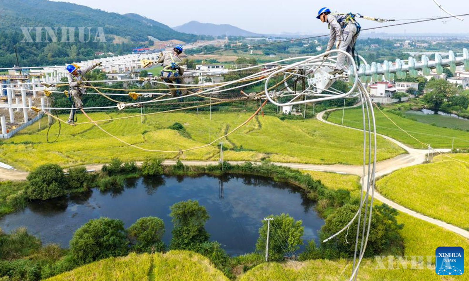 တရုတ်နိုင်ငံအရှေ့ပိုင်းအန်းဟွေးပြည်နယ် ဟွိုင်နင်ခရိုင် ရှိလျှပ်စစ်ဓာတ်အားပေးပို့လွှတ်ရေးလိုင်းများ ပေါ်တွင်အလုပ်လုပ်နေသည့် အလုပ်သမားများကို ၂၀၂၅ ခုနှစ် အောက်တိုဘာ ၂ ရက်က ဒရုန်းဖြင့် ရိုက်ကူးသည့်ပုံတွင် တွေ့ရစဥ် (ဆင်ဟွာ)