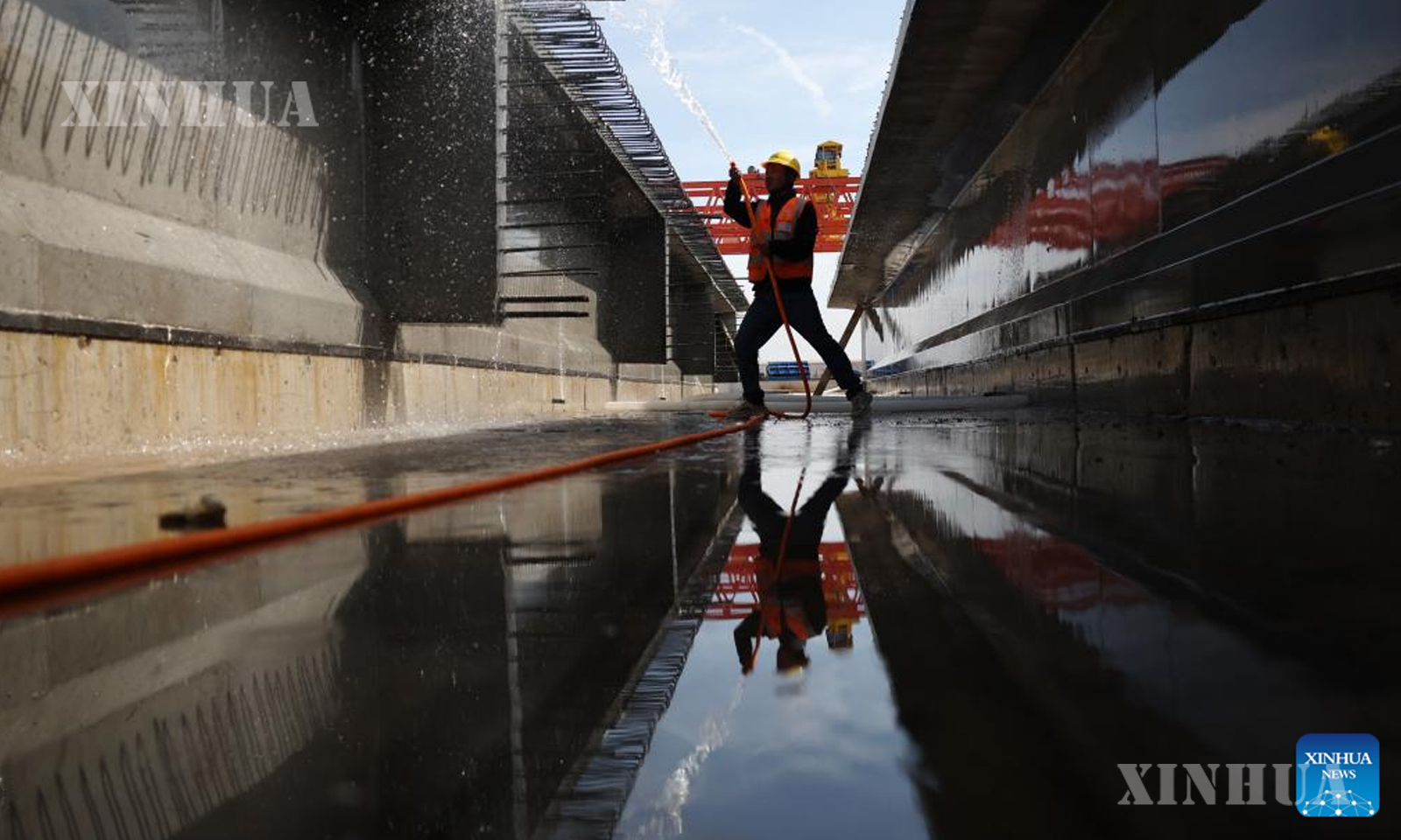 တရုတ်နိုင်ငံအနောက်မြောက်ပိုင်း ကန်းစုပြည်နယ် ပိုင်ရင်မြို့ ရှိဆောက်လုပ်ရေးလုပ်ငန်းခွင်တစ်ခုတွင် ရေဆေးကြောနေသည့်အလုပ်သမားတစ်ဦးကို ၂၀၂၅ ခုနှစ် အောက်တိုဘာ ၂ ရက်က တွေ့ရစဥ် (ဆင်ဟွာ)