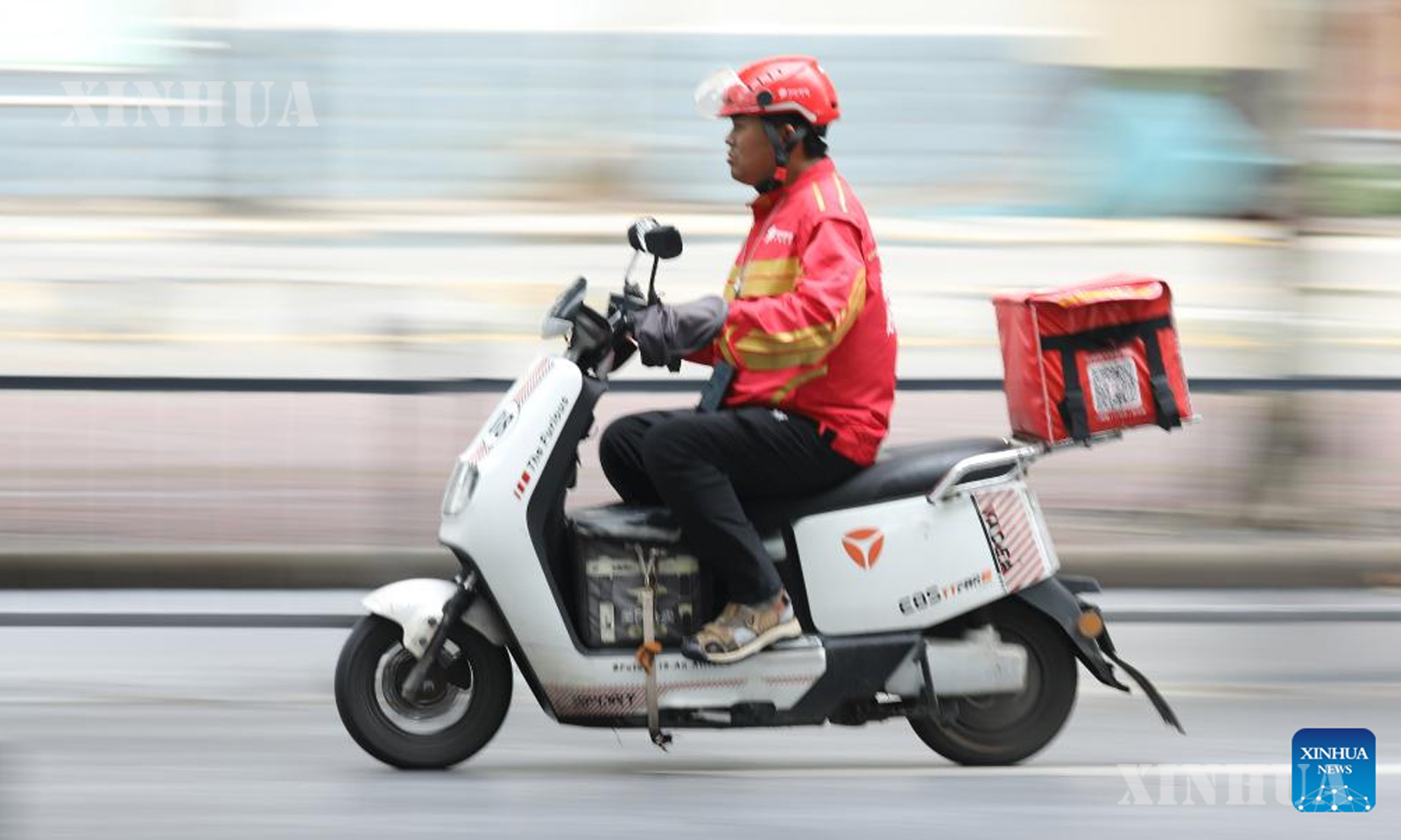 တရုတ်နိုင်ငံအလယ်ပိုင်း ဟဲနန်ပြည်နယ် ကျောင်းကျော့၊ ဝန်းရှန့်ခရိုင်ရှိ လမ်းတစ်ခုတွင် အစားအသောက်ပို့ဆောင်သူတစ်ဦး ဆိုင်ကယ်စီးနင်းသွားလာနေသည်ကို ၂၀၂၅ ခုနှစ် အောက်တိုဘာ ၂ ရက်က တွေ့ရစဥ် (ဆင်ဟွာ)