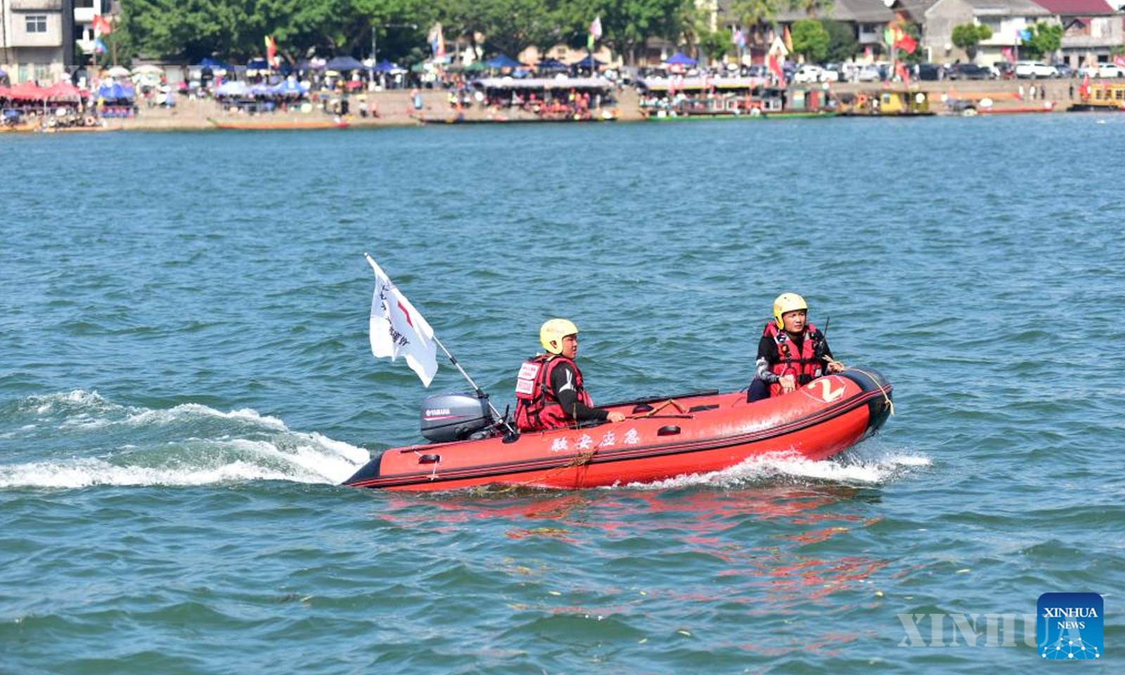 Photo (11) Rescuers patrol the waters for a dragon boat race in Rong’an County, south China’s Guangxi Zhuang Autonomous Region, Oct. 2, 2025 (Photo by Liao Zuping/Xinhua)