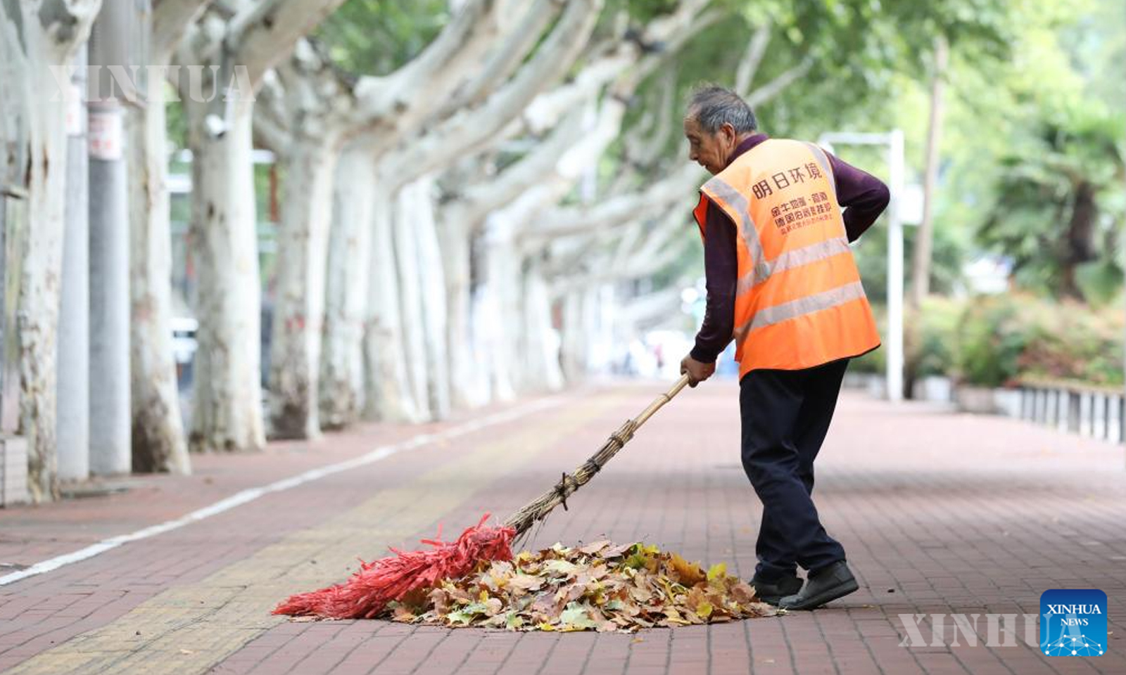 Photo (12) A sanitation worker cleans fallen leaves in Wenxian County, Jiaozuo City, central China’s Henan Province, Oct. 2, 2025. (Photo by Xu Hongxing/Xinhua)