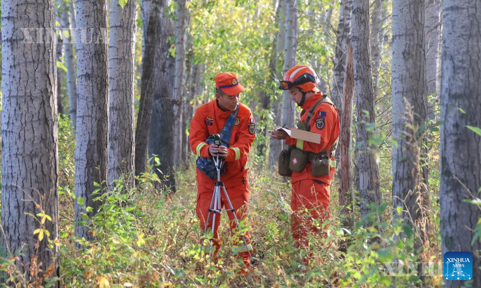 Photo (14) Firefighters measure wind, humidity and flammable content in a forest in Harbin, northeast China’s Heilongjiang Province, Oct. 2, 2025. (Photo by Yang Tieyan/Xinhua)