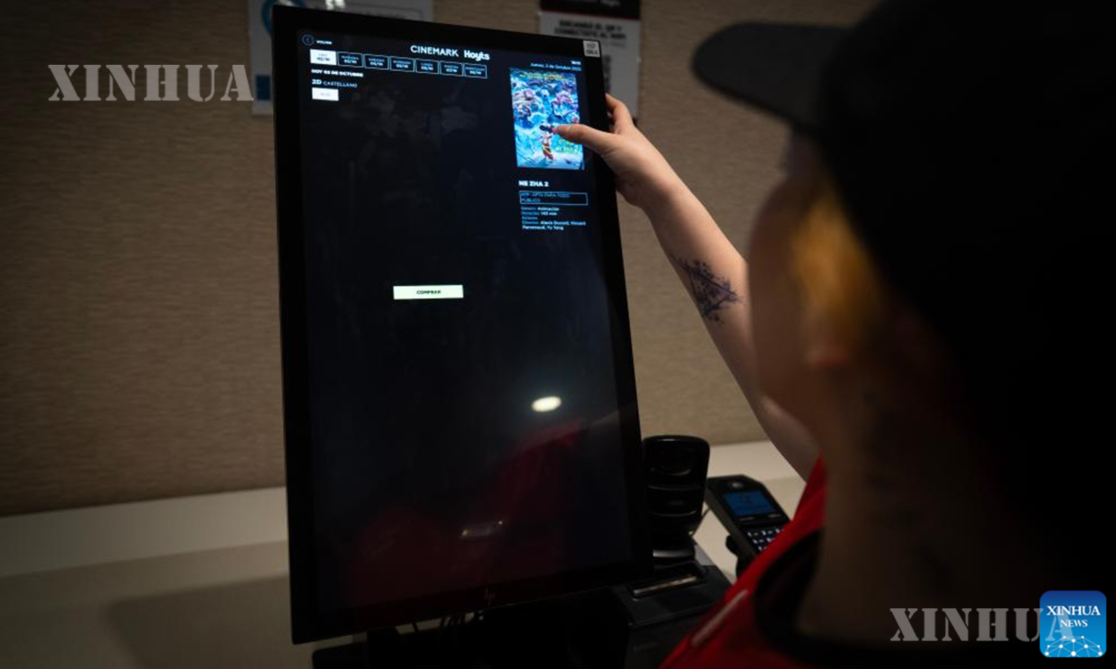 အာဂျင်တီးနားနိုင်ငံ မြို့တော်ဗျူနိုအေးရိစ်ရှိ ရုပ်ရှင်ရုံတစ်ရုံ၌ တရုတ်အန်နီမေးရှင်းရုပ်ရှင် “Ne Zha 2” ကို ပထမဆုံးပြသပွဲအတွက် လက်မှတ်ရုံ၌ အလုပ်လုပ်နေသည့် လက်မှတ်ရောင်းသူတစ်ဦးကို ၂၀၂၅ ခုနှစ် အောက်တိုဘာ ၂ ရက်က တွေ့ရစဉ် (ဆင်ဟွာ)