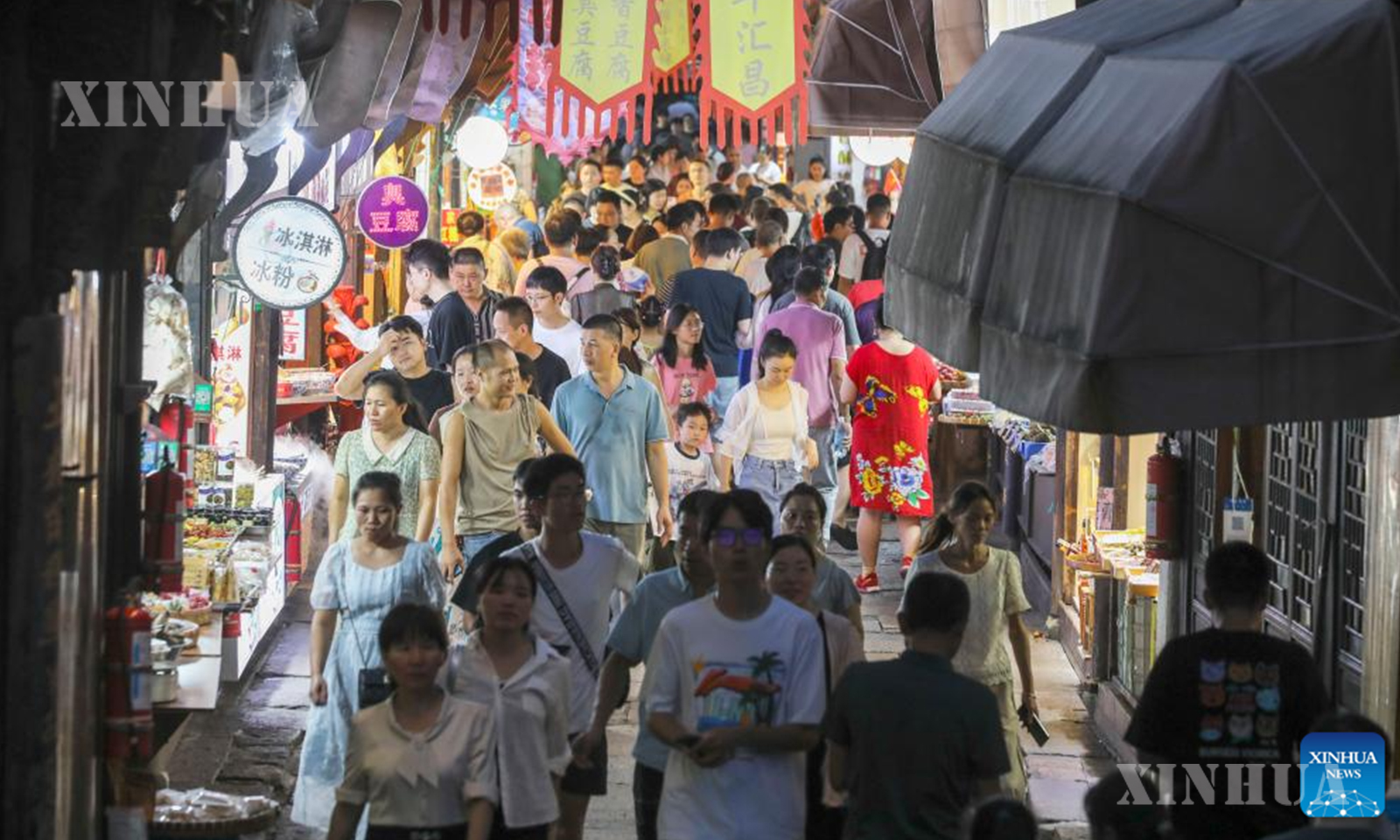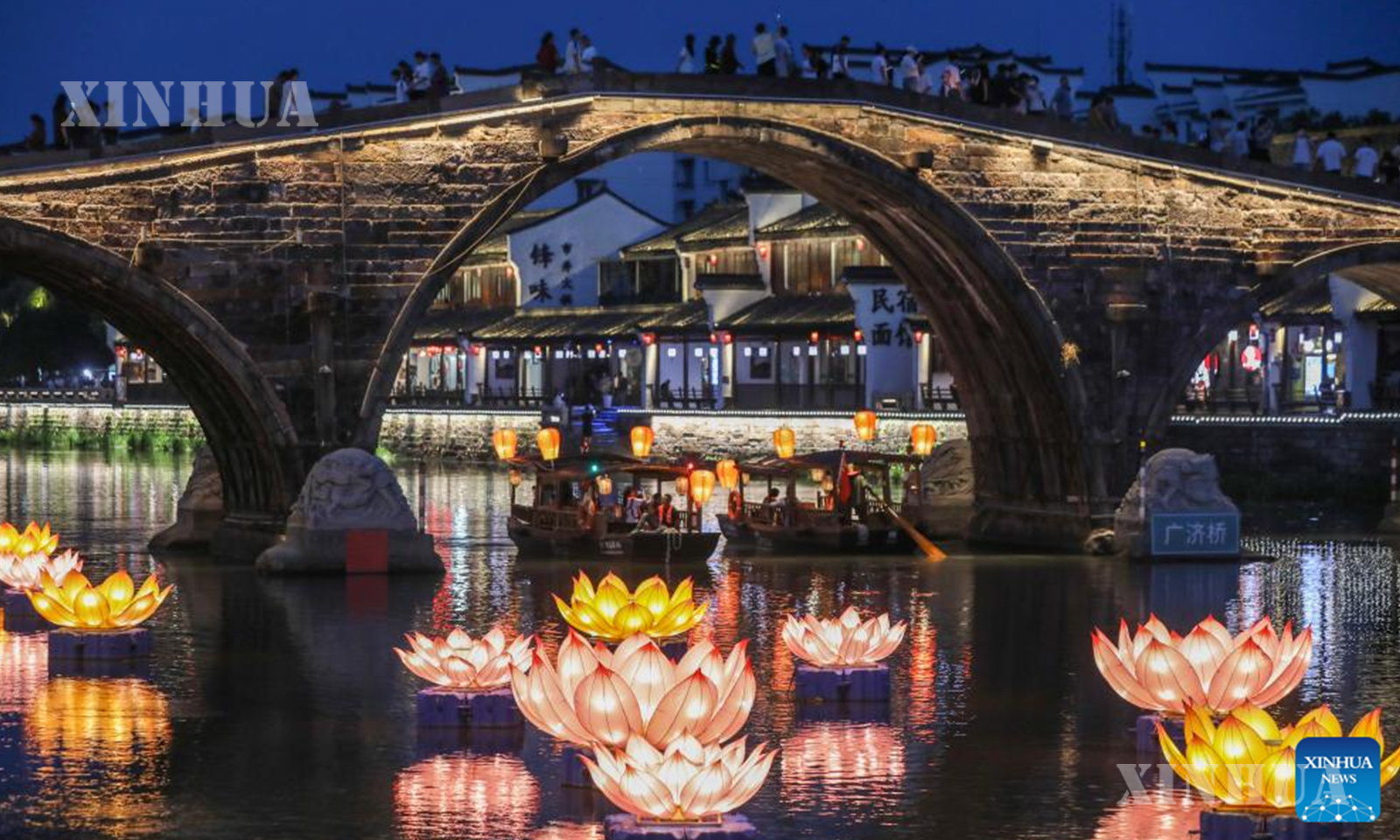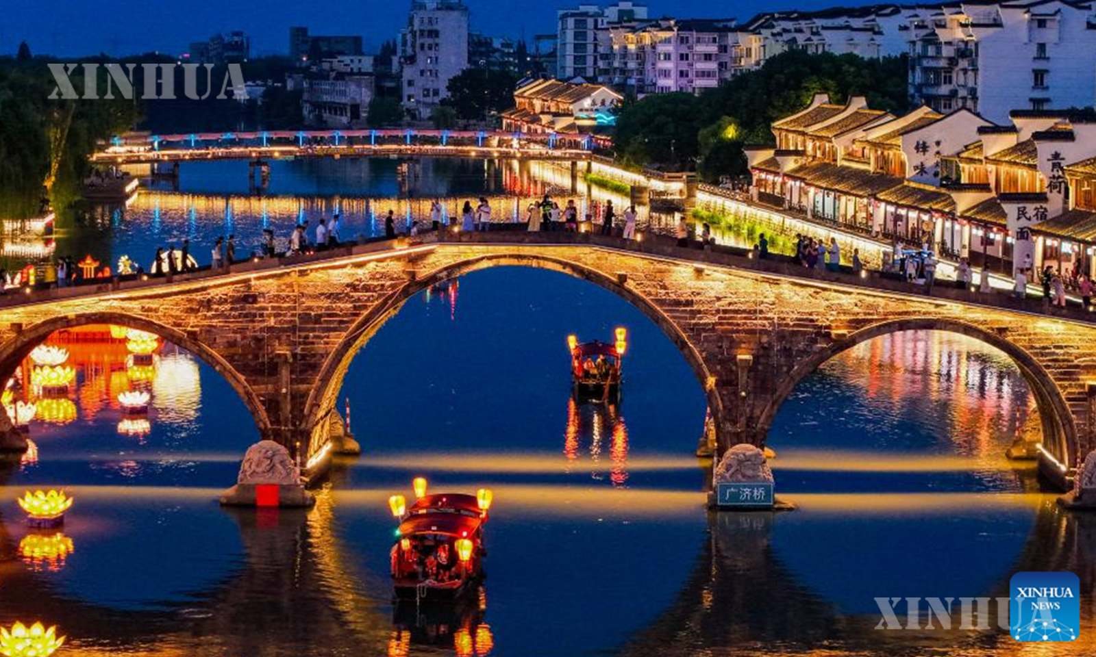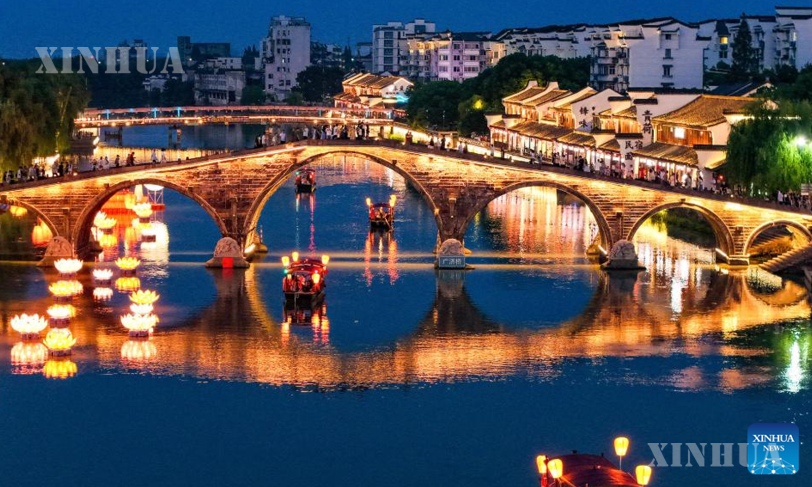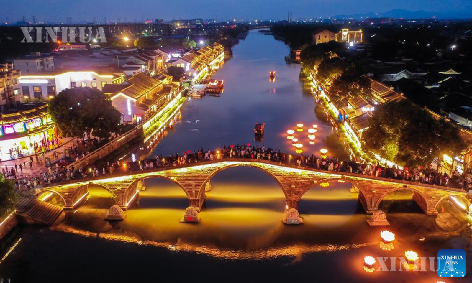 တရုတ်နိုင်ငံ အရှေ့ပိုင်း ကျဲ့ကျန်းပြည်နယ် ဟန်ကျိုးမြို့ရှိ ထန်ချီးရှေးဟောင်းမြို့က အောက်တိုဘာ ၁ ရက်၌ စတင်ခဲ့သည့် ရှစ်ရက်ကြာ အမျိုးသားနေ့နှင့် ဆောင်းဦးလယ်ပွဲတော်အားလပ်ရက်အတွင်း ခရီးသွားဧည့်သည်များအား ညအပျော်စီးလှေခရီးစဉ်များနှင့် စူးရှလင်းလက်တောက်ပနေသော မီးပုံးရောင်စုံများဖြင့် မြိုင်ဆိုင်ဝေဆာစွာ လှပတင့်တယ်နေသည့် ညမြင်ကွင်းတို့ကို ပေးဆောင်လျက်ရှိကြောင်း သိရသည်။ (Xinhua)