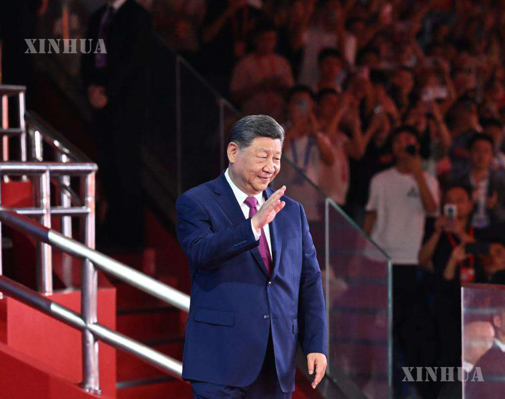 တရုတ်နိုင်ငံတောင်ပိုင်း ကွမ်တုန်းပြည်နယ် ကွမ်ကျိုးမြို့၌ကျင်းပခဲ့သည့် တရုတ်နိုင်ငံ၏ ၁၅ ကြိမ်မြောက်အမျိုးသားအားကစားပြိုင်ပွဲ ဖွင့်ပွဲအခမ်းအနားသို့ တက်ရောက်ပြီး အားကစားပြိုင်ပွဲကို ဖွင့်လှစ်ကြောင်းကြေညာပေးခဲ့သည့် တရုတ်ကွန်မြူနစ်ပါတီ (CPC) ဗဟိုကော်မတီ အထွေထွေ အတွင်းရေးမှူးချုပ်၊ တရုတ်နိုင်ငံသမ္မတ၊ ဗဟိုစစ်ကော်မရှင် ဥက္ကဋ္ဌ ရှီကျင့်ဖိန်ကို ၂၀၂၅ ခုနှစ် နိုဝင်ဘာ ၉ ရက်က တွေ့ရစဥ် (ဆင်ဟွာ)