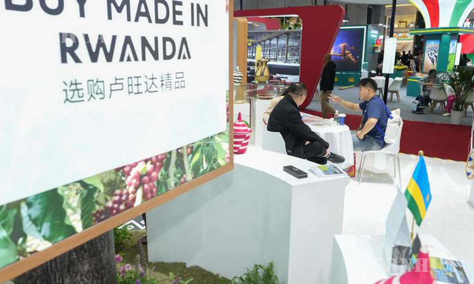 တရုတ်နိုင်ငံ အရှေ့ပိုင်း ရှန်ဟိုင်းမြို့တွင် ကျင်းပသည့် ၈ ကြိမ်မြောက် တရုတ်နိုင်ငံတကာသွင်းကုန်ပြပွဲအတွင်း ရဝမ်ဒါနိုင်ငံပြခန်း၌ မေးမြန်းပြောဆိုနေသူများအား ၂၀၂၅ ခုနှစ် နိုဝင်ဘာ ၇ ရက်က တွေ့ရစဉ် (ဆင်ဟွာ)