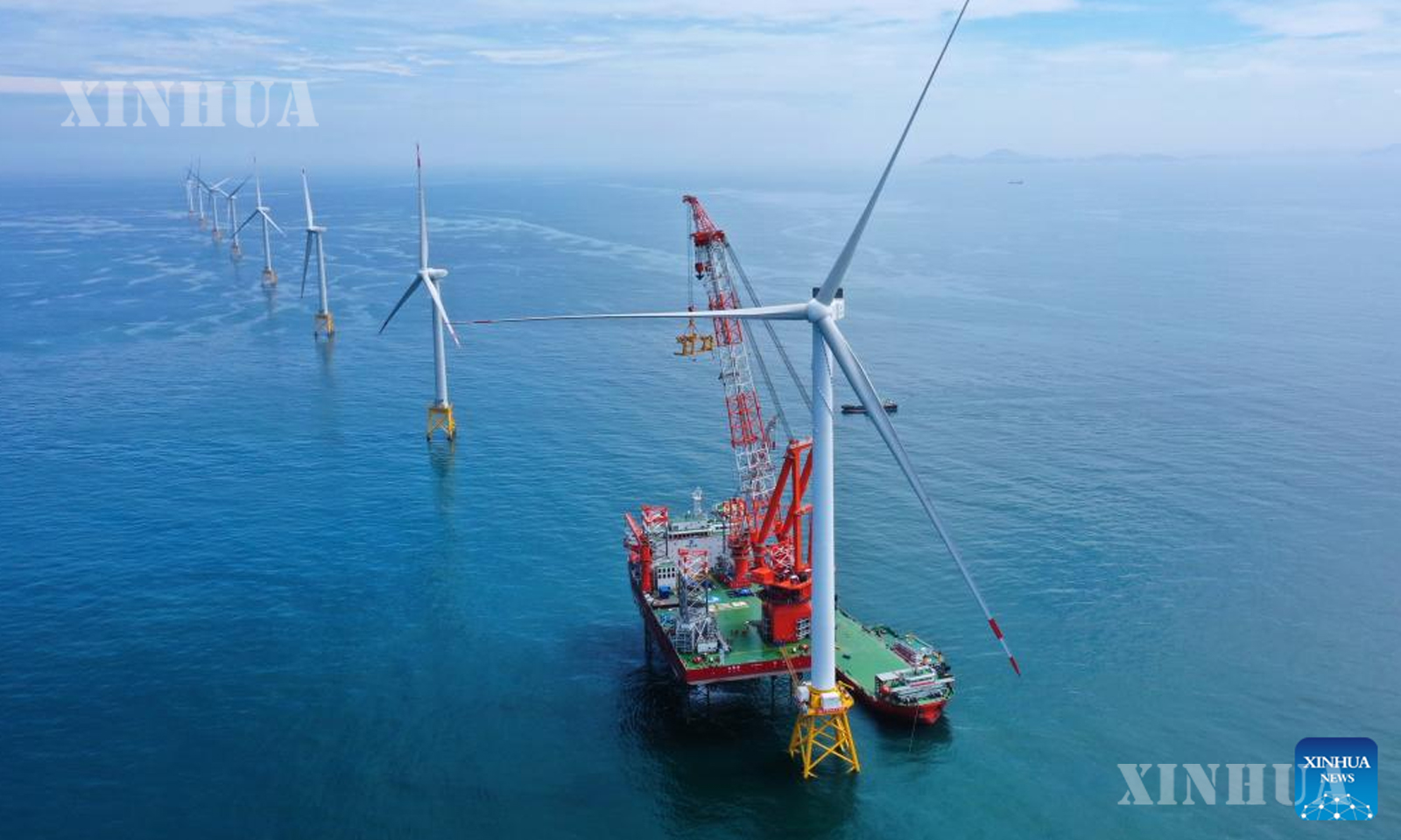 Photo :This aerial photo taken on June 28, 2023 shows a 16-megawatt wind turbine installed at the Fujian offshore wind farm operated by the China Three Gorges Corporation off the coast of southeast China’s Fujian Province. (Xinhua/Lin Shanchuan)
