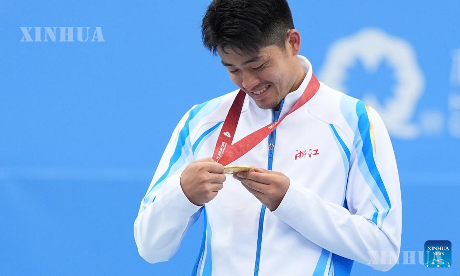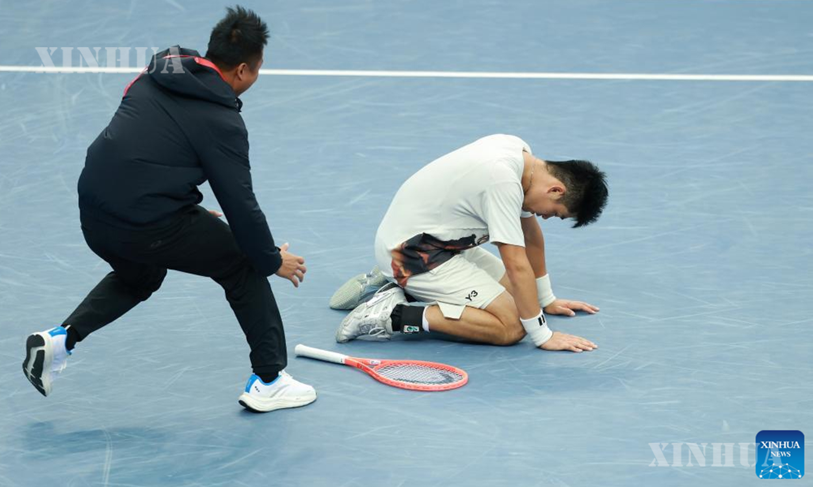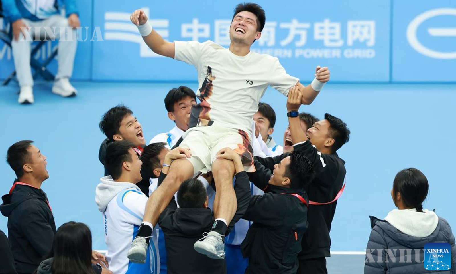 တရုတ်နိုင်ငံ တောင်ပိုင်း ကွမ်တုန်းပြည်နယ် ဟန်ချင်ကျွန်းတွင် တရုတ်နိုင်ငံ၏ ၁၅ ကြိမ်မြောက် အမျိုးသားအားကစားပြိုင်ပွဲ၌ မြို့တော်ပေကျင်းမှ ရှန်းကျွင့်ချိန်နှင့် ကျဲ့ကျန်းပြည်နယ်မှ ဝူရိပင် တို့၏ တင်းနစ်အမျိုးသားတစ်ဦးချင်းဖိုင်နယ်ပွဲပြီးနောက် အနိုင်ရရှိမှုအတွက် အောင်ပွဲခံနေသည့် ဝူရိပင် ကို ၂၀၂၅ ခုနှစ် နိုဝင်ဘာ ၂၀ ရက်က တွေ့ရစဉ် (ဆင်ဟွာ)