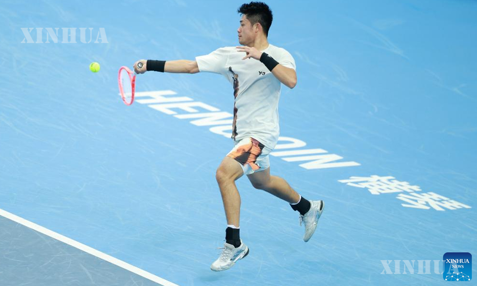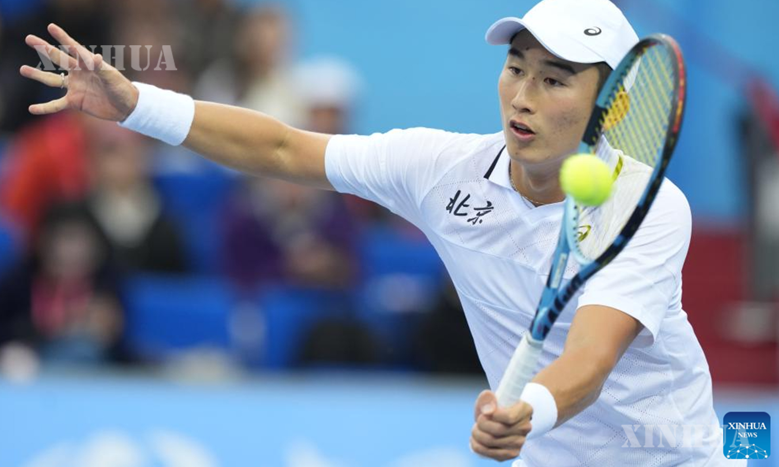 Wu Yibing hits a return during the tennis men’s singles final between Shang Juncheng of Beijing and Wu Yibing of Zhejiang at China’s 15th National Games in Hengqin, south China’s Guangdong Province, Nov. 20, 2025. (Xinhua/Yan Linyun)