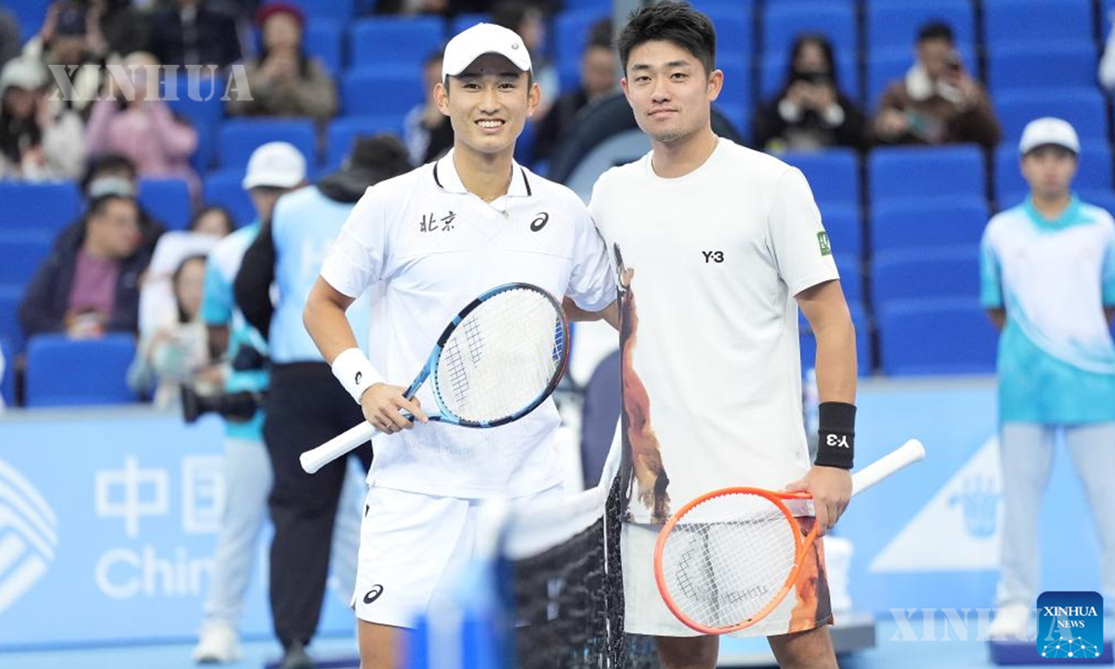 Shang Juncheng (L) and Wu Yibing pose for photos before the tennis men’s singles final between Shang Juncheng of Beijing and Wu Yibing of Zhejiang at China’s 15th National Games in Hengqin, south China’s Guangdong Province, Nov. 20, 2025. (Xinhua/Yan Linyun)
