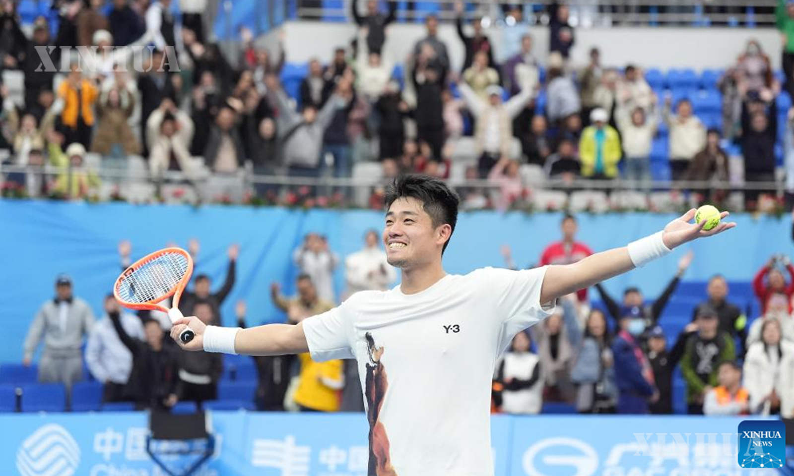 Wu Yibing celebrates victory after the tennis men’s singles final between Shang Juncheng of Beijing and Wu Yibing of Zhejiang at China’s 15th National Games in Hengqin, south China’s Guangdong Province, Nov. 20, 2025. (Xinhua/Yan Linyun)