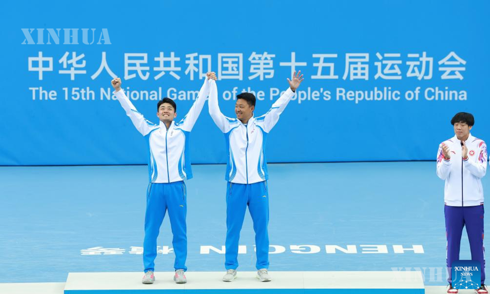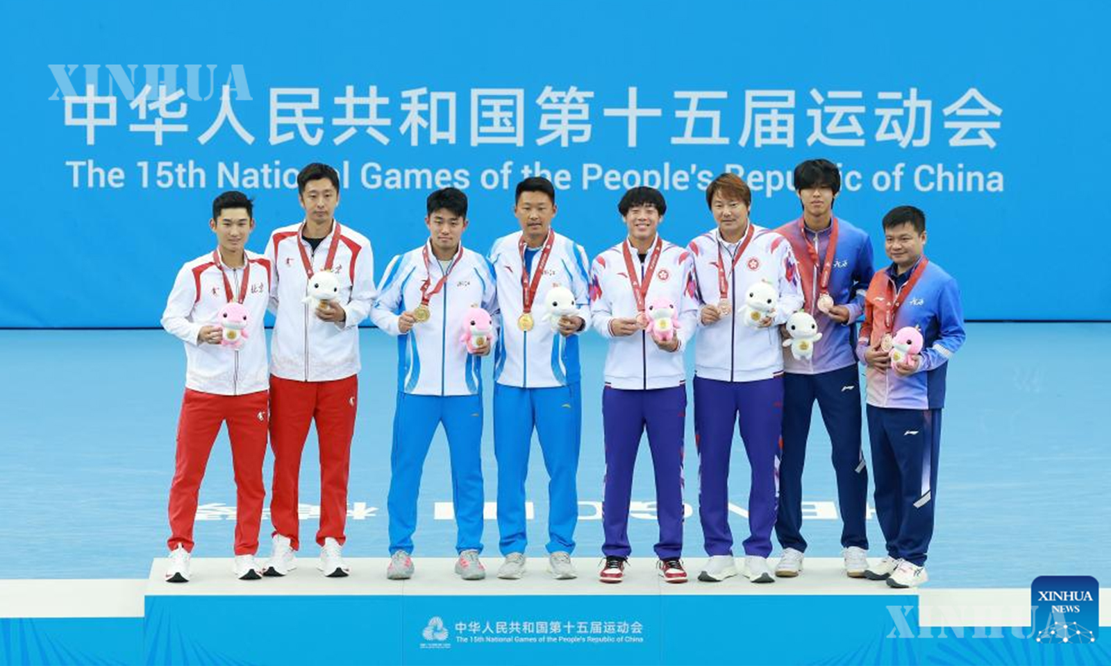 တရုတ်နိုင်ငံ တောင်ပိုင်း ကွမ်တုန်းပြည်နယ် ဟန်ချင်ကျွန်းတွင် တရုတ်နိုင်ငံ၏ ၁၅ ကြိမ်မြောက် အမျိုးသားအားကစားပြိုင်ပွဲ၌ မြို့တော်ပေကျင်းမှ ရှန်းကျွင့်ချိန် နှင့် ကျဲ့ကျန်းပြည်နယ်မှ ဝူရိပင် တို့၏ တင်းနစ်အမျိုးသားတစ်ဦးချင်းဖိုင်နယ်ပွဲအတွက် ဆုပေးပွဲအတွင်း ကျဲ့ကျန်းပြည်နယ်မှ ရွှေတံဆိပ်ဆုရရှိသူ ဝူရိပင် (ဝဲဘက်တတိယ)၊ မြို့တော်ပေကျင်းမှ ငွေတံဆိပ်ဆုရရှိသူ ရှန်းကျွင့်ချိန် (ဝဲဘက်ပထမ)၊ ပူးတွဲကြေးတံဆိပ်ဆုရရှိခဲ့ကြသည့် ဟောင်ကောင်အထူးအုပ်ချုပ်ခွင့်ရဒေသမှ ဝမ်ကျယ်လျင် (ယာဘက်စတုတ္တ) နှင့် ကွမ်ရှီး (ကျွမ့်) ကိုယ်ပိုင်အုပ်ချုပ်ခွင့်ရဒေသမှ ကျိုးယိ (ယာဘက်ဒုတိယ) တို့အား ၎င်းတို့၏ နည်းပြများနှင့်အတူ ၂၀၂၅ ခုနှစ် နိုဝင်ဘာ ၂၀ ရက်က တွေ့ရစဉ် (ဆင်ဟွာ)