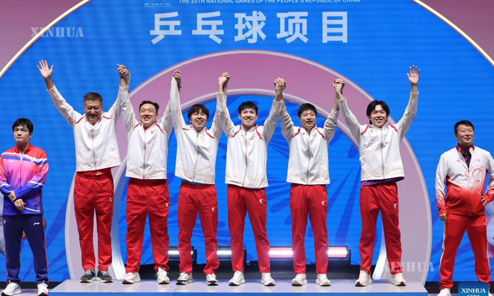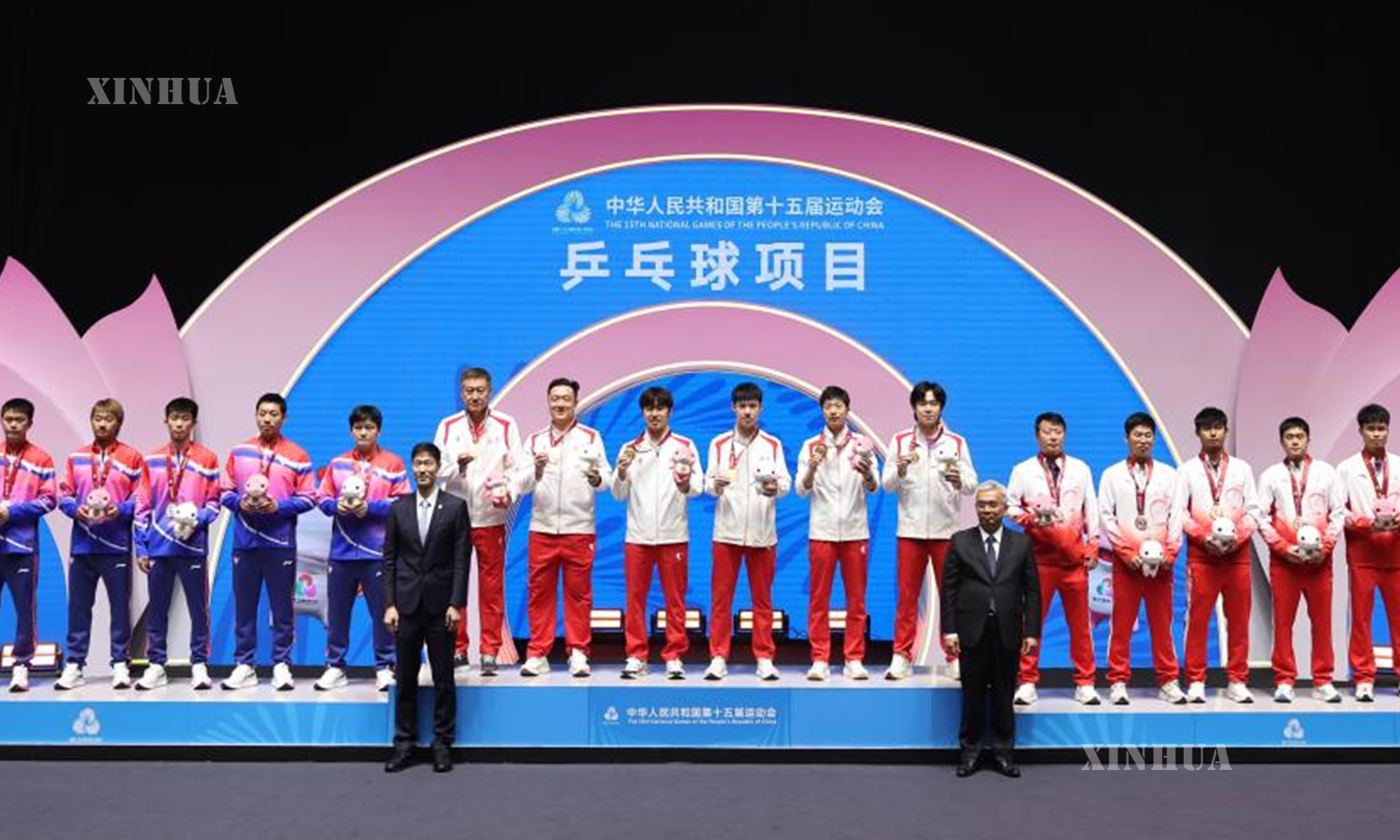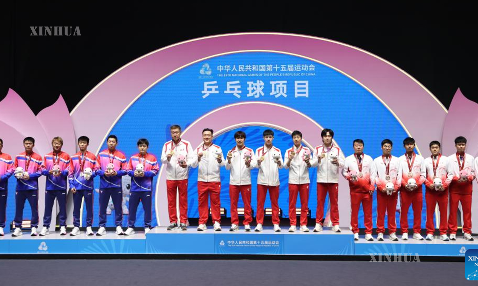 တရုတ်နိုင်ငံ တောင်ပိုင်း မကာအိုအထူးအုပ်ချုပ်ခွင့်ရဒေသတွင် ကျင်းပသည့် တရုတ်နိုင်ငံ၏ ၁၅ ကြိမ်မြောက် အမျိုးသားအားကစားပြိုင်ပွဲ၌ စားပွဲတင်တင်းနစ်အမျိုးသားအဖွဲ့လိုက်ပြိုင်ပွဲအတွက် ဆုပေးပွဲအတွင်း မှတ်တမ်းဓာတ်ပုံရိုက်ကူးနေသည့် ရွှေတံဆိပ်ဆုရ ပေကျင်းအသင်း၊ ငွေတံဆိပ်ဆုရ ရှန်ဟိုင်းအသင်းနှင့် ကြေးတံဆိပ်ဆုရ ကွမ်တုန်းအသင်းတို့ကို ၎င်းတို့၏ နည်းပြများနှင့်အတူ ၂၀၂၅ ခုနှစ် နိုဝင်ဘာ ၂၀ ရက်က တွေ့ရစဉ် (ဆင်ဟွာ)