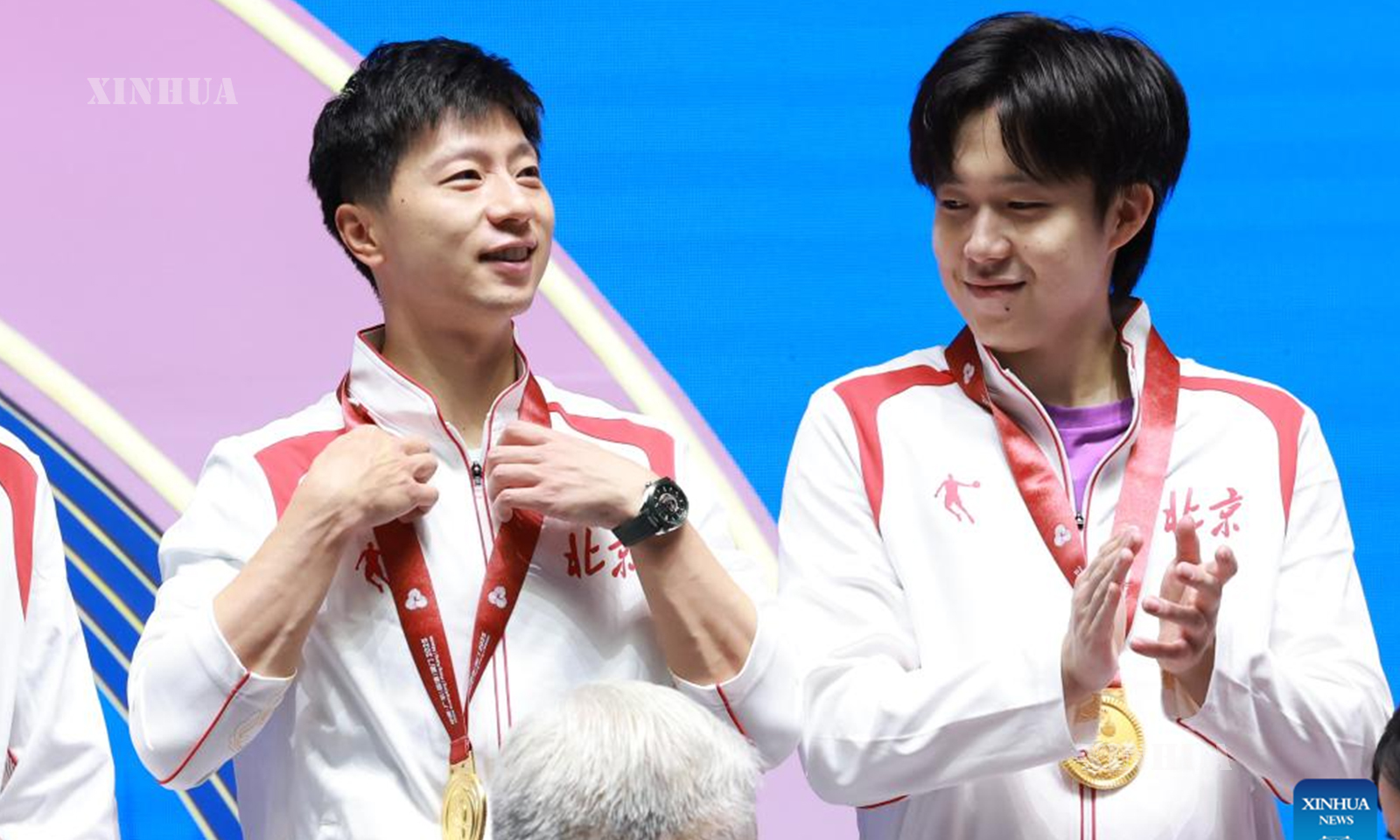 Gold medalists Ma Long (L) and Wang Chuqin of Beijing react during the awarding ceremony for the men’s team of table tennis at China’s 15th National Games in Macao, south China, Nov. 20, 2025. (Xinhua/Liang Xu)