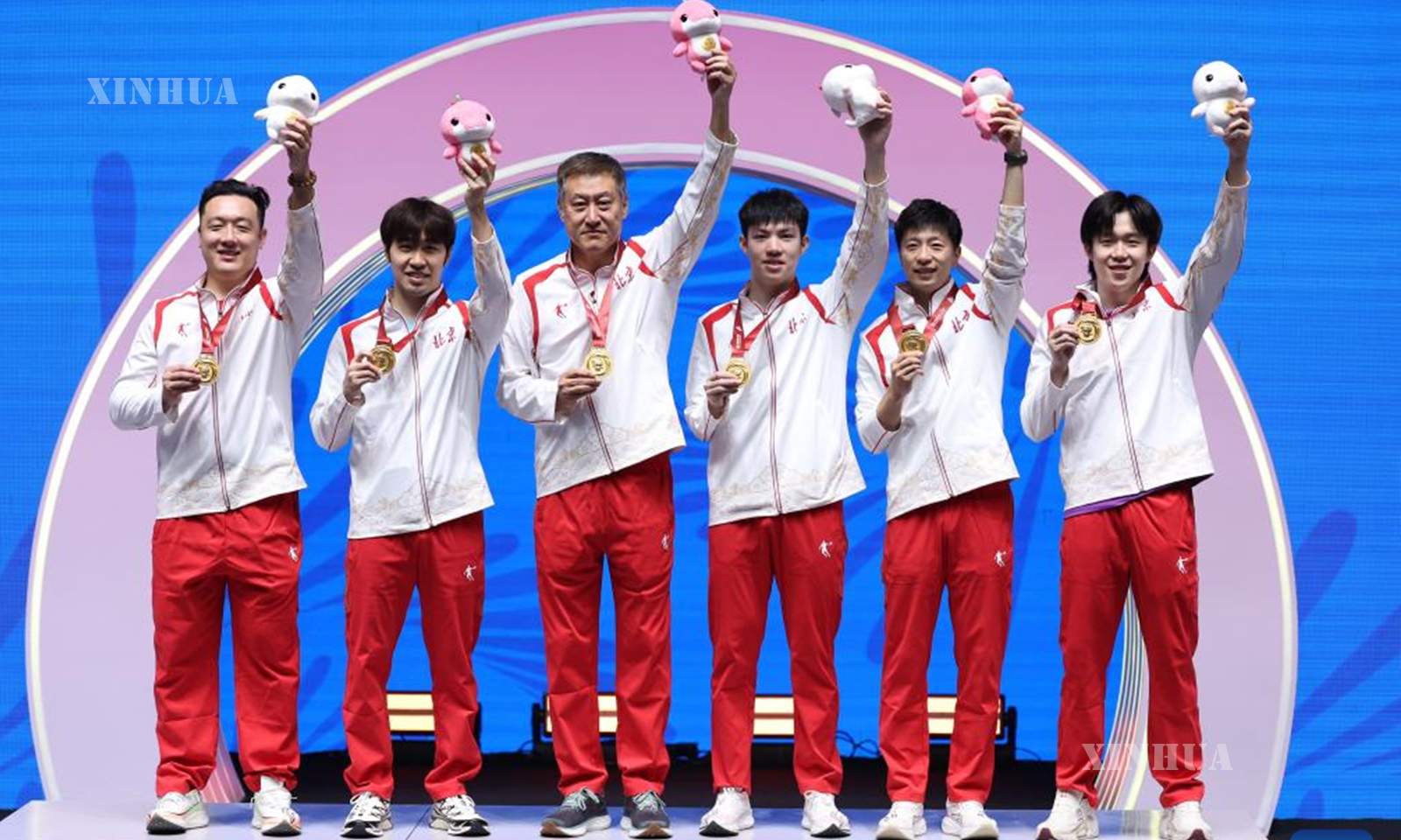 Gold medalists team Beijing react during the awarding ceremony for the men’s team of table tennis at China’s 15th National Games in Macao, south China, Nov. 20, 2025. (Xinhua/Liang Xu)
