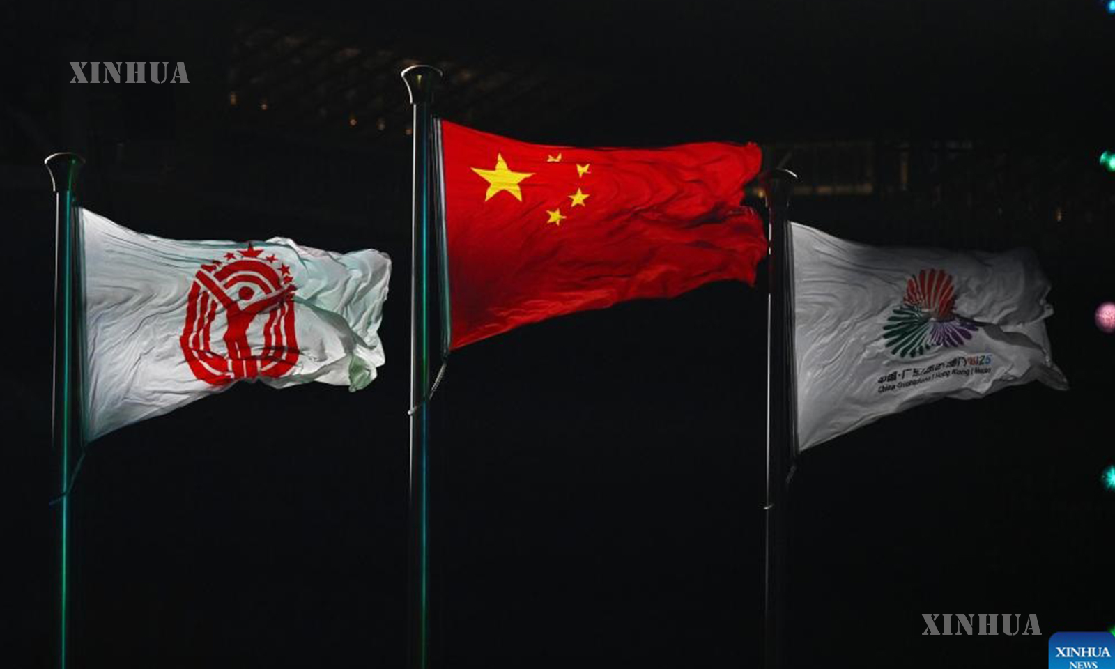 တရုတ်နိုင်ငံ တောင်ပိုင်း ကွမ်တုန်းပြည်နယ် ဆန်းကျန့်မြို့တွင် တရုတ်နိုင်ငံ၏ ၁၅ ကြိမ်မြောက် အမျိုးသားအားကစားပြိုင်ပွဲ ပိတ်ပွဲအခမ်းအနားအတွင်း တရုတ်နိုင်ငံတော်အလံကို ၂၀၂၅ ခုနှစ် နိုဝင်ဘာ ၂၁ ရက်က တွေ့ရစဉ် (ဆင်ဟွာ)