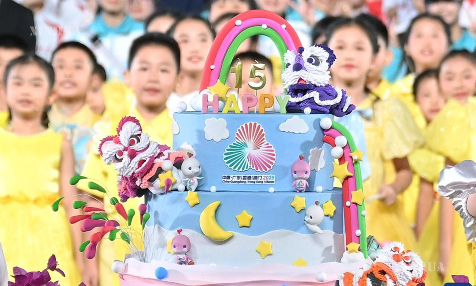 တရုတ်နိုင်ငံ တောင်ပိုင်း ကွမ်တုန်းပြည်နယ် ဆန်းကျန့်မြို့တွင် တရုတ်နိုင်ငံ၏ ၁၅ ကြိမ်မြောက် အမျိုးသားအားကစားပြိုင်ပွဲ ပိတ်ပွဲအခမ်းအနားအတွင်း တရုတ်နိုင်ငံ၏ ၁၅ ကြိမ်မြောက် အမျိုးသားအားကစားပြိုင်ပွဲအထိမ်းအမှတ် ကိတ်မုန့်ကို ၂၀၂၅ ခုနှစ် နိုဝင်ဘာ ၂၁ ရက်က တွေ့ရစဉ် (ဆင်ဟွာ)