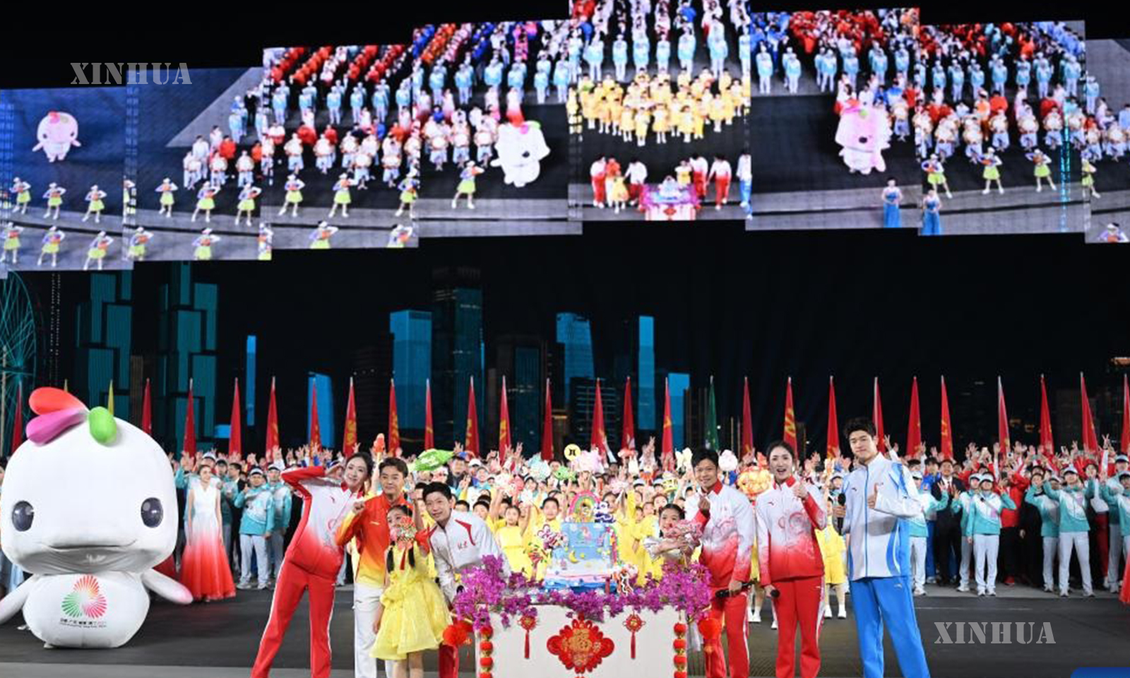 တရုတ်နိုင်ငံ တောင်ပိုင်း ကွမ်တုန်းပြည်နယ် ဆန်းကျန့်မြို့တွင် တရုတ်နိုင်ငံ၏ ၁၅ ကြိမ်မြောက် အမျိုးသားအားကစားပြိုင်ပွဲ ပိတ်ပွဲအခမ်းအနားမြင်ကွင်းကို ၂၀၂၅ ခုနှစ် နိုဝင်ဘာ ၂၁ ရက်က တွေ့ရစဉ် (ဆင်ဟွာ)