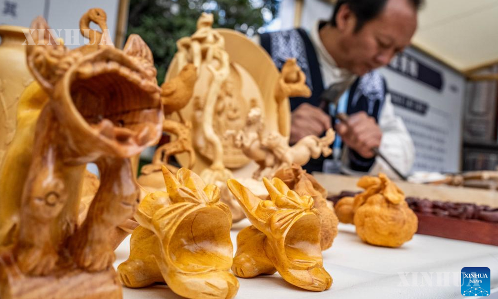 Yang Huanpei, a provincial-level inheritor for Jianchuan Wood Carving, demonstrates his skills during a promotion week for intangible cultural heritage brands in Dali, southwest China’s Yunnan Province, Nov. 23, 2025. (Xinhua/Hu Chao)