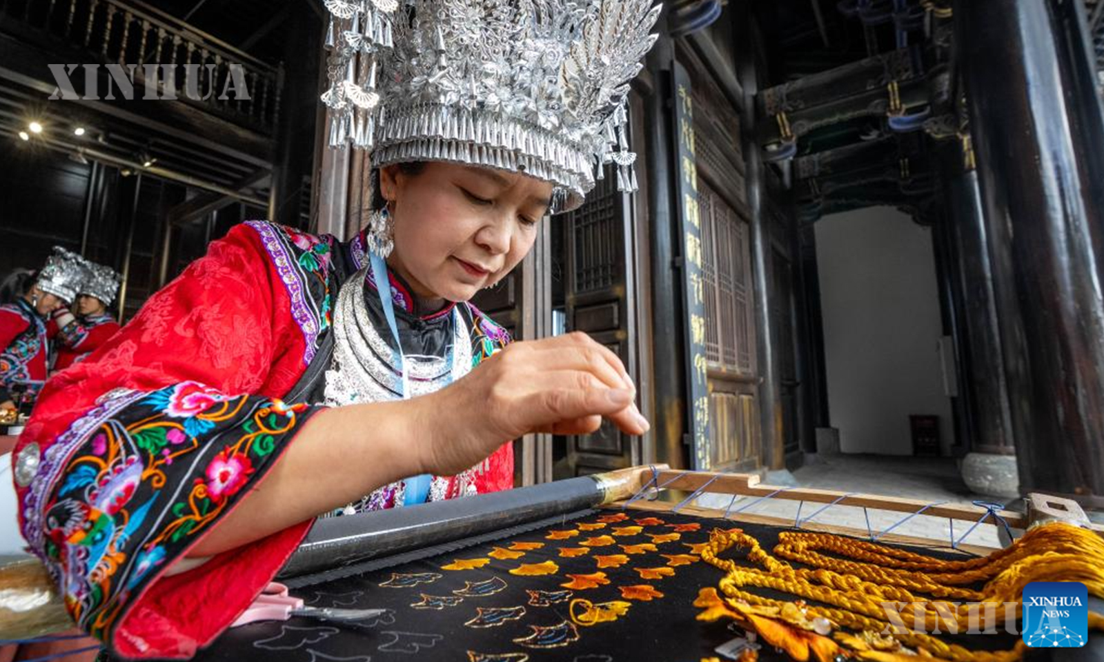 Chen Guotao, a city-level inheritor for Miao Embroidery, shows her skills during a promotion week for intangible cultural heritage brands in Dali, southwest China’s Yunnan Province, Nov. 23, 2025. (Xinhua/Hu Chao)