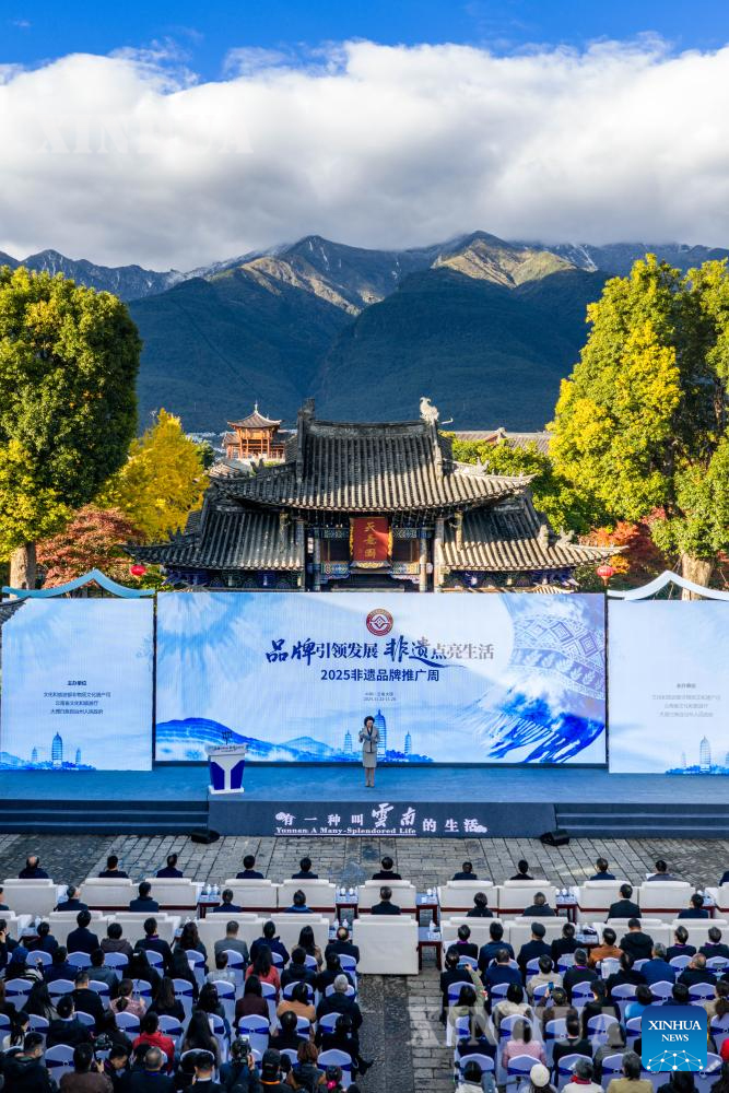 တရုတ်နိုင်ငံ အနောက်တောင်ပိုင်း ယူနန်ပြည်နယ် တာ့လီမြို့၌ ဒြပ်မဲ့ယဉ်ကျေးမှုအမွေအနှစ်အမှတ်တံဆိပ်များအတွက် ပရိုမိုးရှင်းသီတင်းပတ်၏ ဖွင့်ပွဲအခမ်းအနားကို ၂၀၂၅ ခုနှစ် နိုဝင်ဘာ ၂၃ ရက်က တွေ့ရစဉ် (ဆင်ဟွာ)