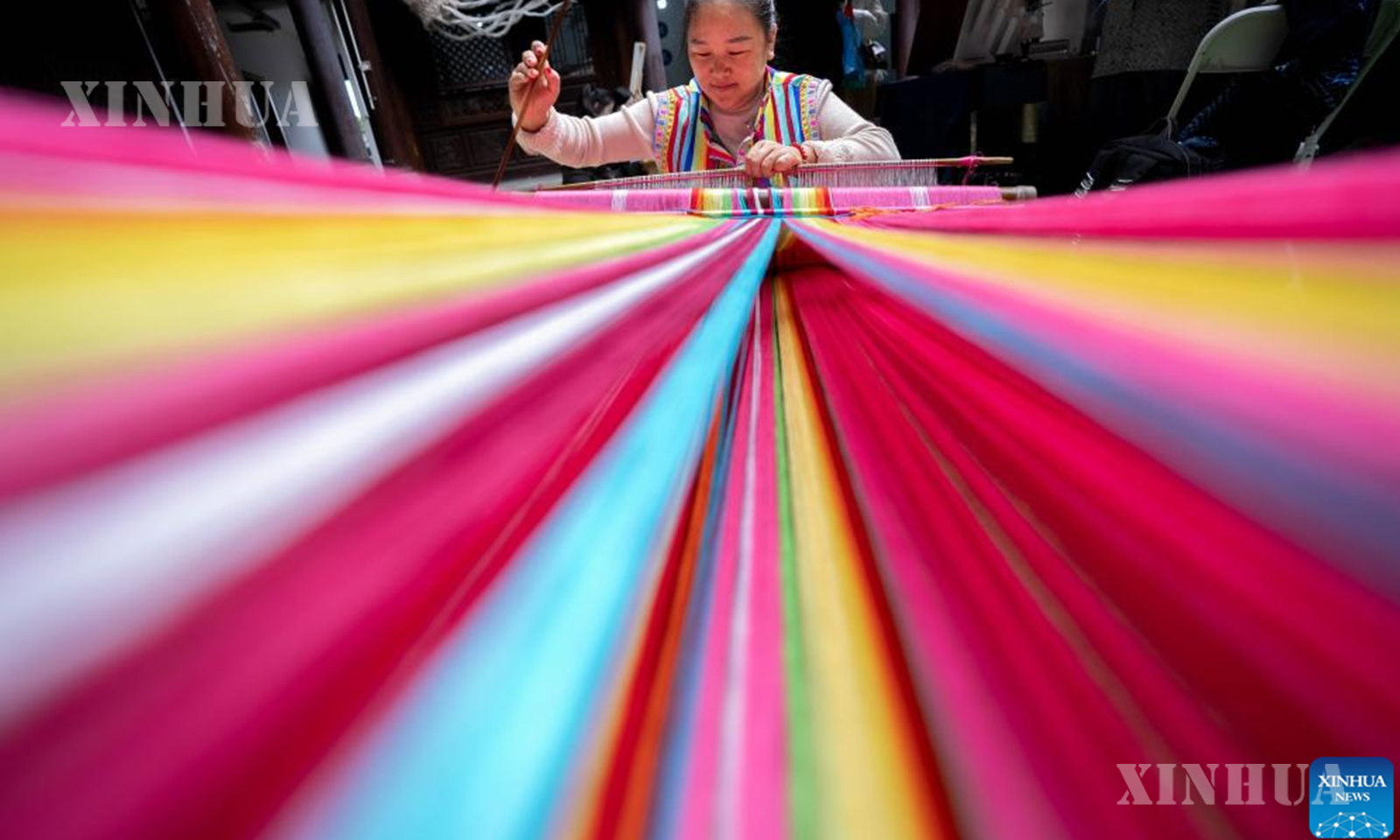 A staff member demonstrates the skills of making Dulong blanket during a promotion week for intangible cultural heritage brands in Dali, southwest China’s Yunnan Province, Nov. 23, 2025. (Xinhua/Hu Chao)
