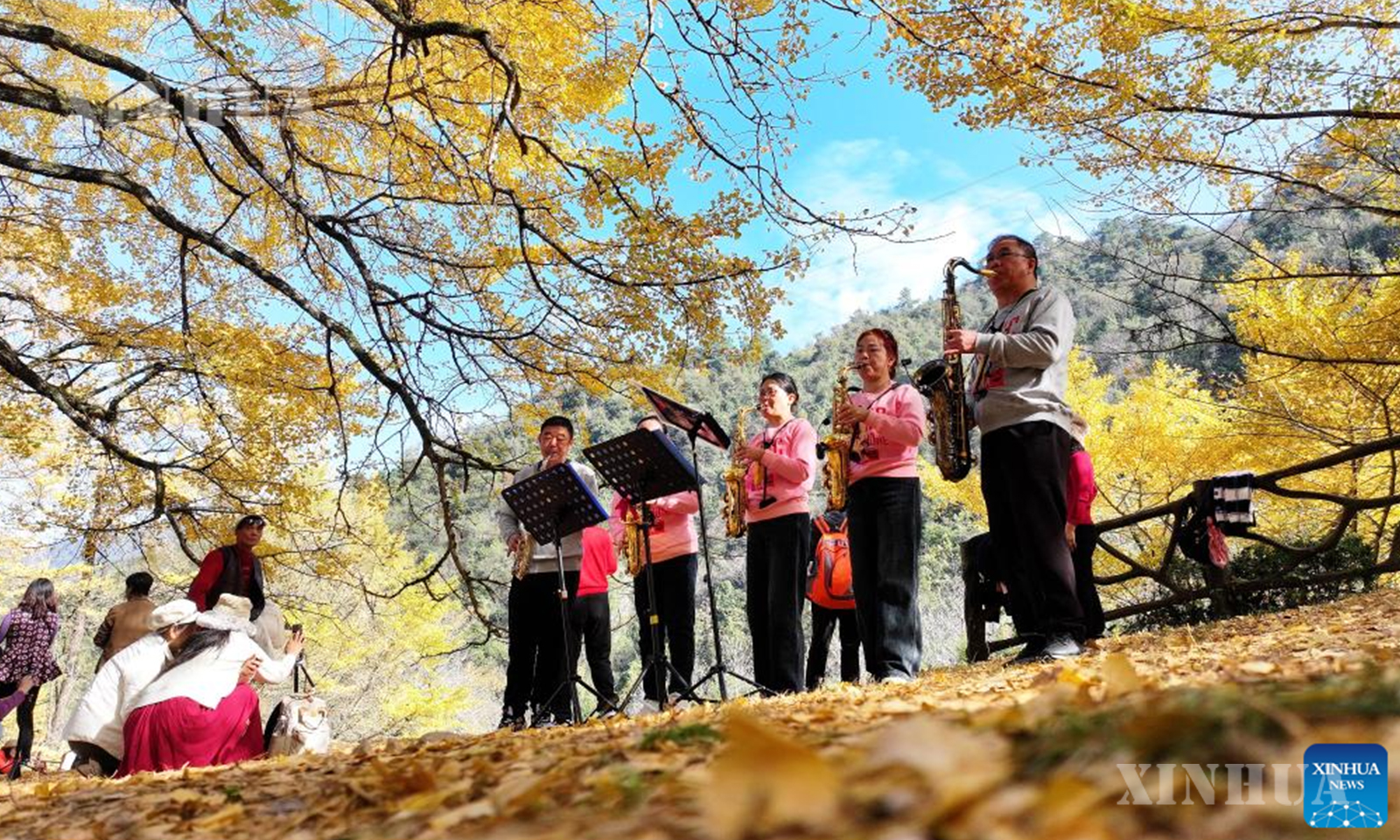 People play the saxophones under ginkgo trees in Tongziao Village, Shuangpai County, Yongzhou City, central China’s Hunan Province, Nov. 23, 2025. (Xinhua/Zhao Zhongzhi)