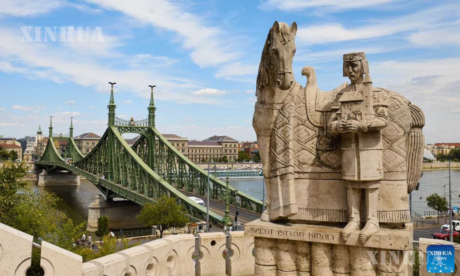 This photo taken on June 23, 2022 shows a statue of St. Stephen, the founding king of Hungary, and the landmark Liberty Bridge in Budapest, Hungary. (Xinhua/Meng Dingbo)