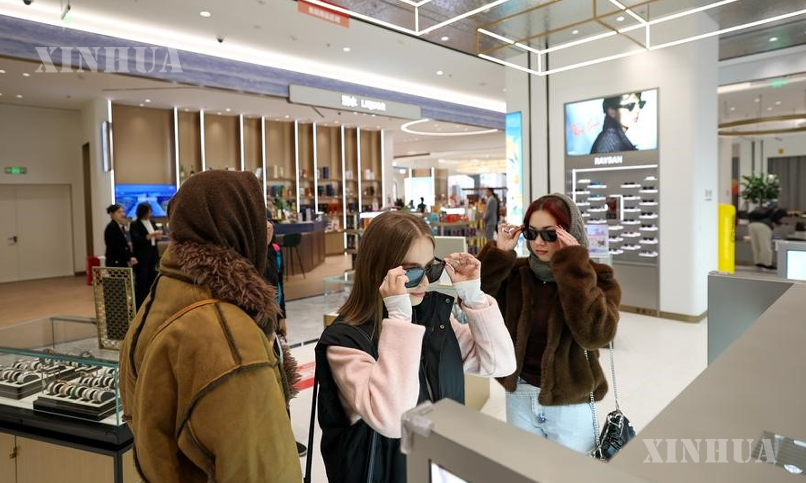 တရုတ်နိုင်ငံ မြောက်ပိုင်း ထျန်းကျင်းမြို့လယ်ရှိ အကောက်ခွန်လွတ်ဆိုင်တစ်ခုတွင် နေကာမျက်မှန် တပ်ဆင်ကြည့်နေသည့် နိုင်ငံခြားသားစျေးဝယ်သူများကို ၂၀၂၅ ခုနှစ် နိုဝင်ဘာ ၂၈ ရက်က တွေ့ရစဥ်(ဆင်ဟွာ)