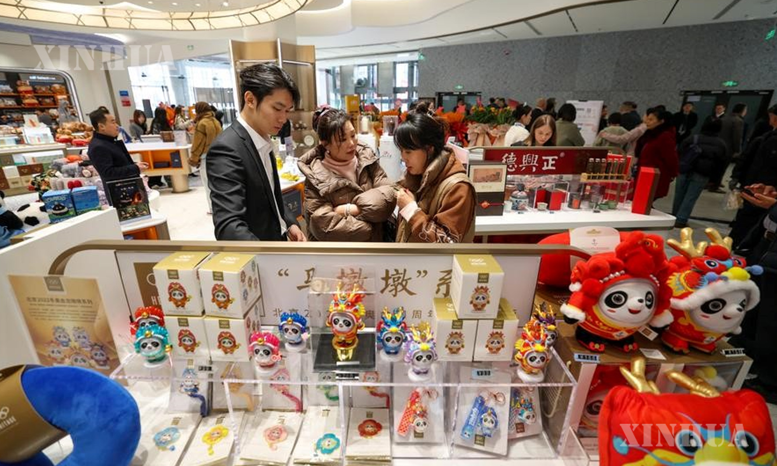 Photo (4)-People shop for products themed on Bing Dwen Dwen, the mascot of Beijing 2022 Olympic Winter Games, at a downtown duty-free shop in north China’s Tianjin Municipality, Nov. 28, 2025. (Xinhua/Sun Fanyue)