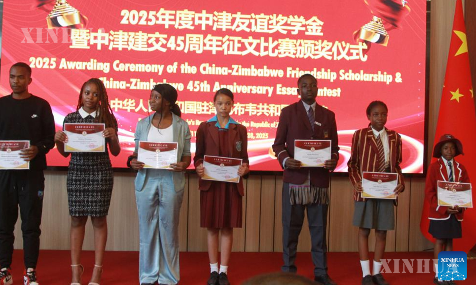 Some winners of the China-Zimbabwe Friendship Scholarship pose for a photo at the award ceremony in Harare, Zimbabwe, Nov. 28, 2025. (Photo by Tafara Mugwara/Xinhua)
