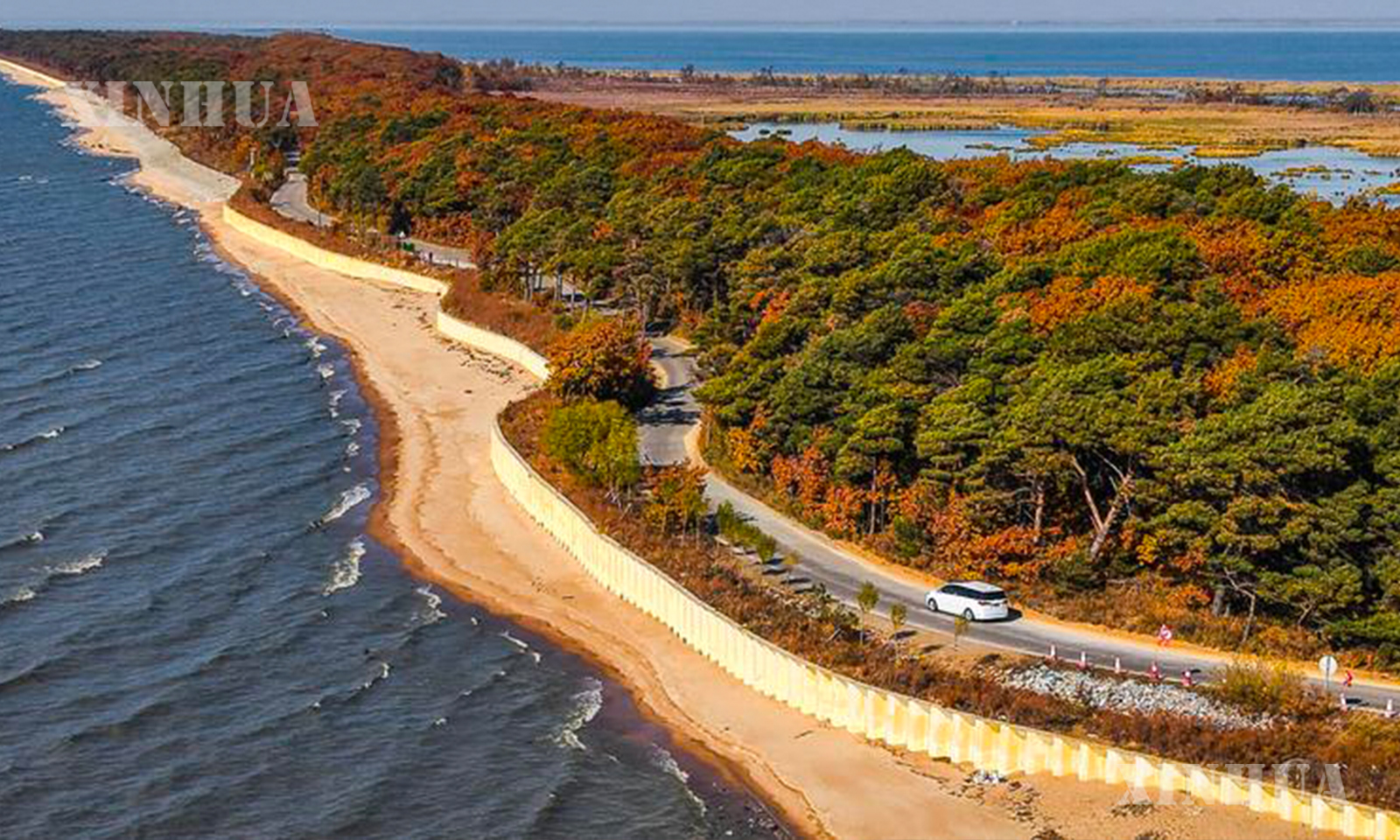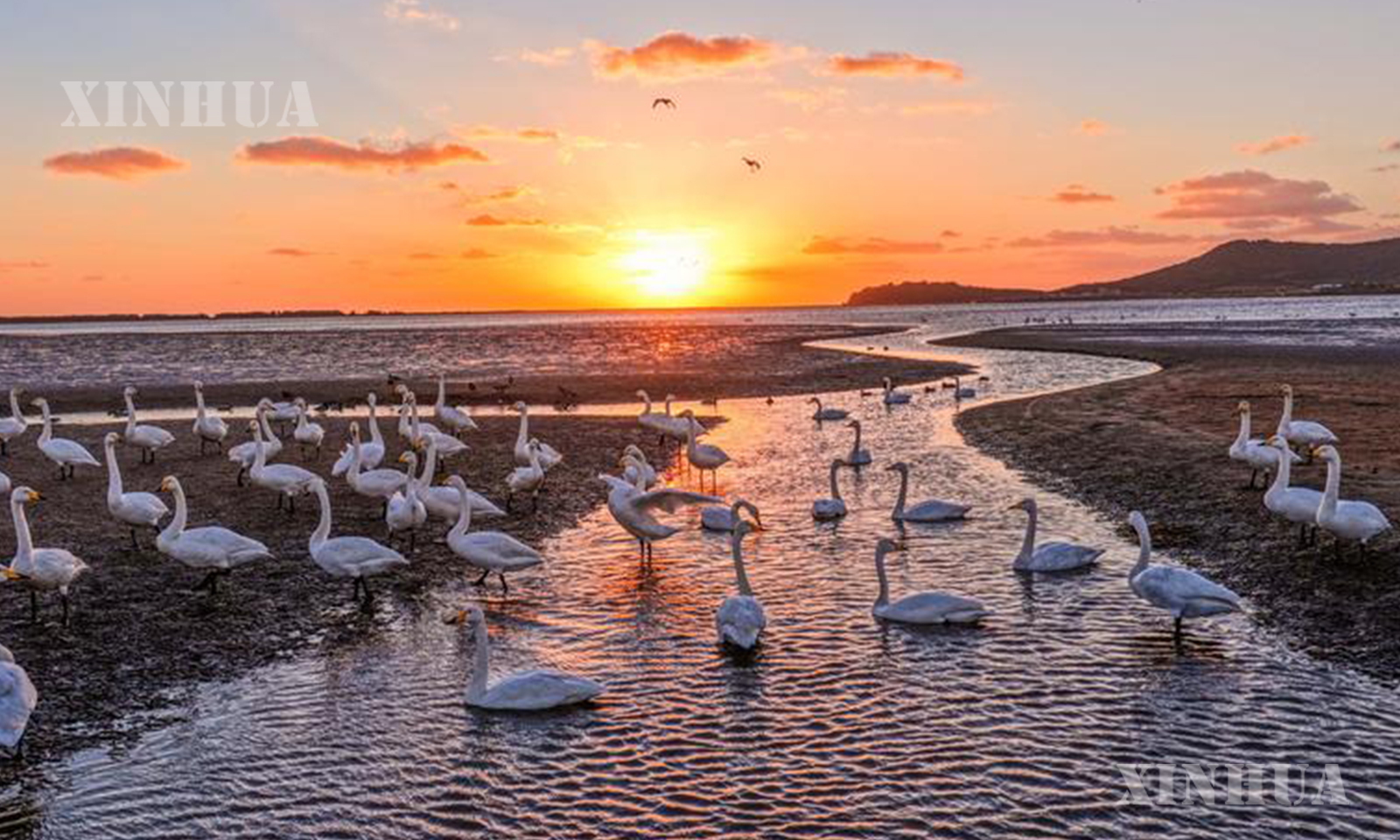 2. (251102) — BEIJING, Nov. 2, 2025 (Xinhua) — A drone photo taken on Nov. 2, 2025 shows a morning view of Swan Lake wetland in Rongcheng City, east China’s Shandong Province. (Photo by Li Xinjun/Xinhua)