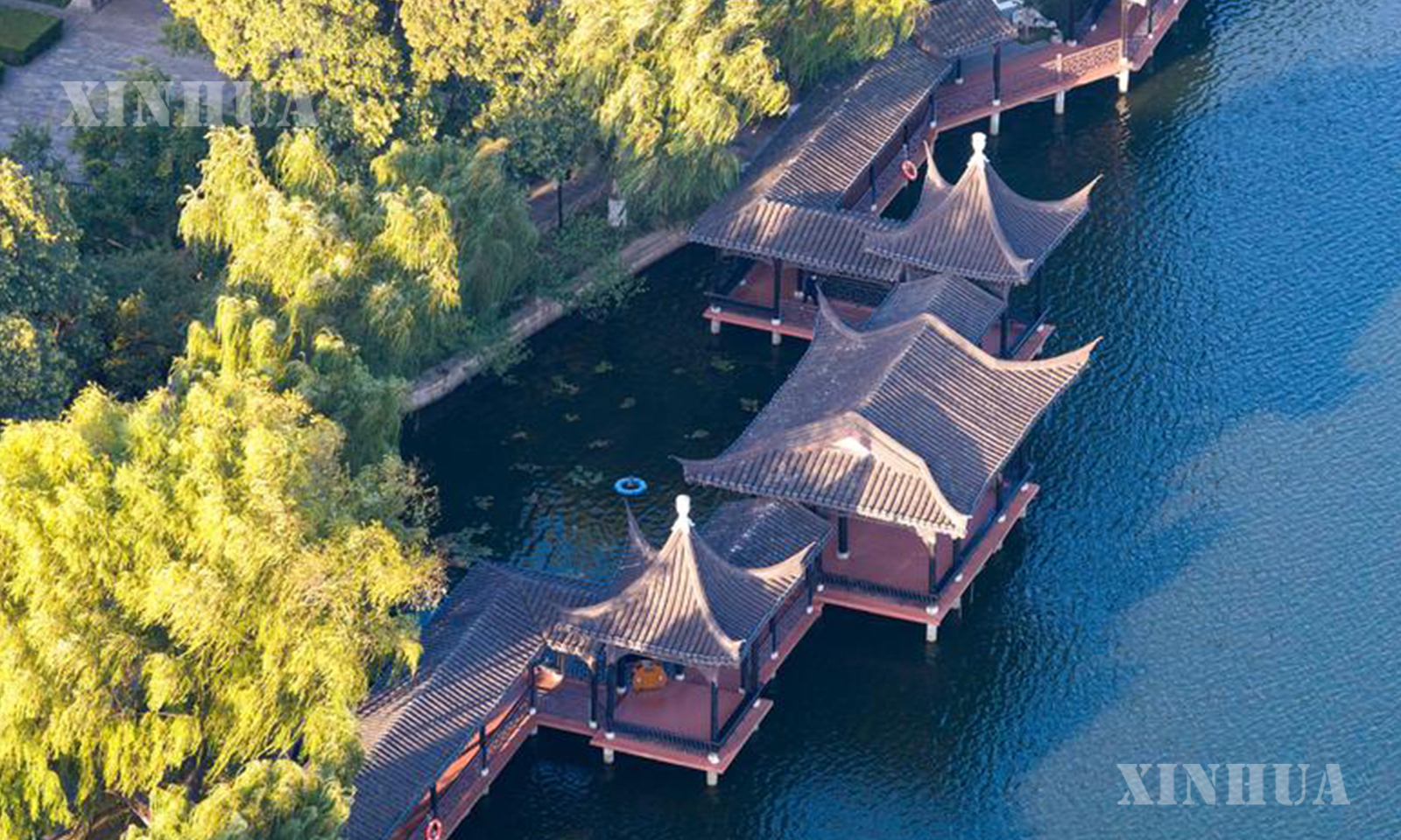 တရုတ်နိုင်ငံ အရှေ့ပိုင်း ဆန်းတုန်းပြည်နယ် ရုန်ချိန်မြို့ ငွေငန်းရေကန်၏ စိမ့်မြေအရပ် နံနက်ခင်း ရှုမြင်ကွင်းအား ၂၀၂၅ ခုနှစ် နိုဝင်ဘာ ၂ ရက်က တွေ့ရစဉ် (ဆင်ဟွာ)
