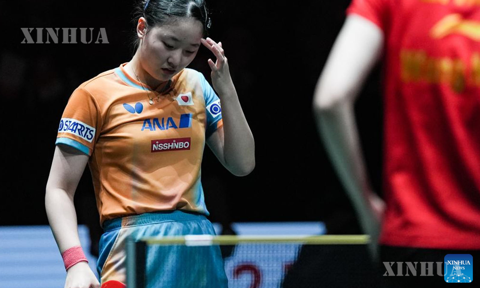 Harimoto Miwa of Japan reacts in the women’s singles match against Wang Manyu of China during the final match between China and Japan at the ITTF Mixed Team World Cup 2025 in Chengdu, southwest China’s Sichuan Province, Dec. 7, 2025. (Xinhua/Wang Xi)