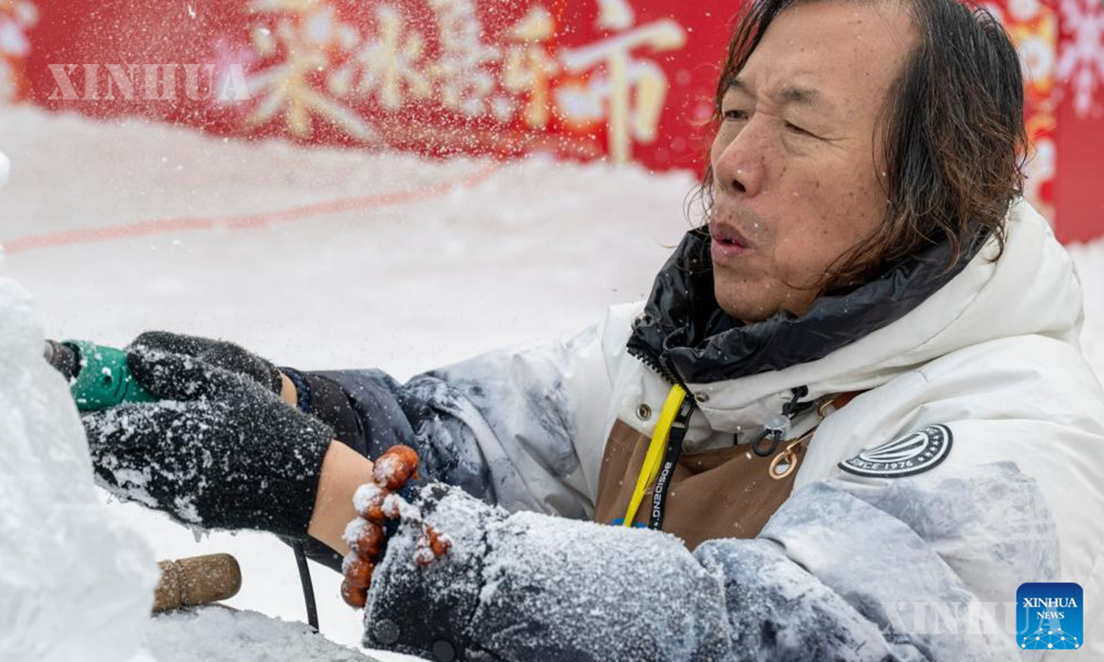 တရုတ်နိုင်ငံ အရှေ့မြောက်ပိုင်း ဟေးလုံကျန်းပြည်နယ် ဟားအယ်ပင်းမြို့၌ ကျင်းပသည့် ရေခဲစုဆောင်းမှုပွဲတော်အတွင်း ရေခဲကောက်နေသည့် ပွဲတော်အဖွဲ့ဝင်များကို ၂၀၂၅ ခုနှစ် ဒီဇင်ဘာ ၇ ရက်က တွေ့ရစဉ် (ဆင်ဟွာ)