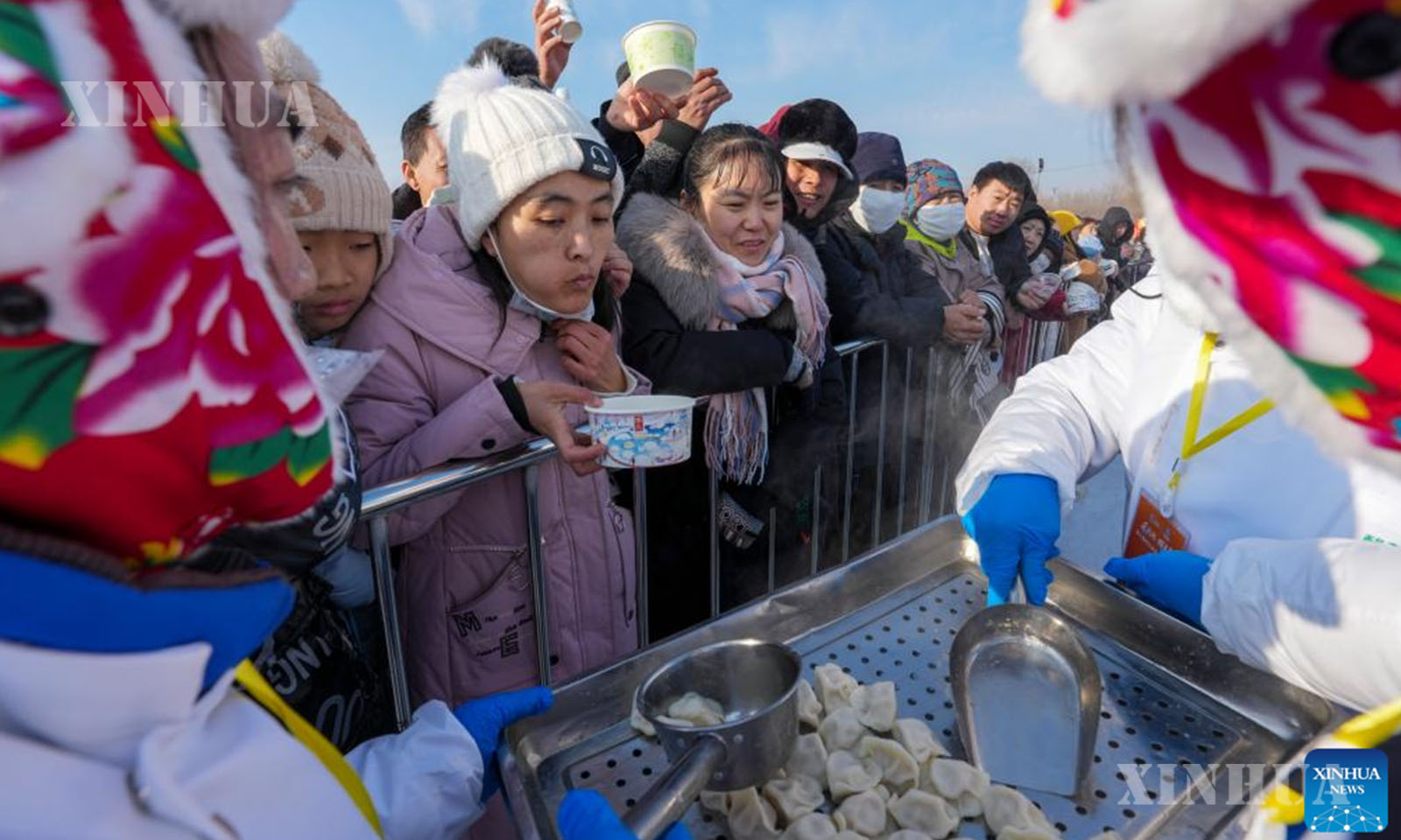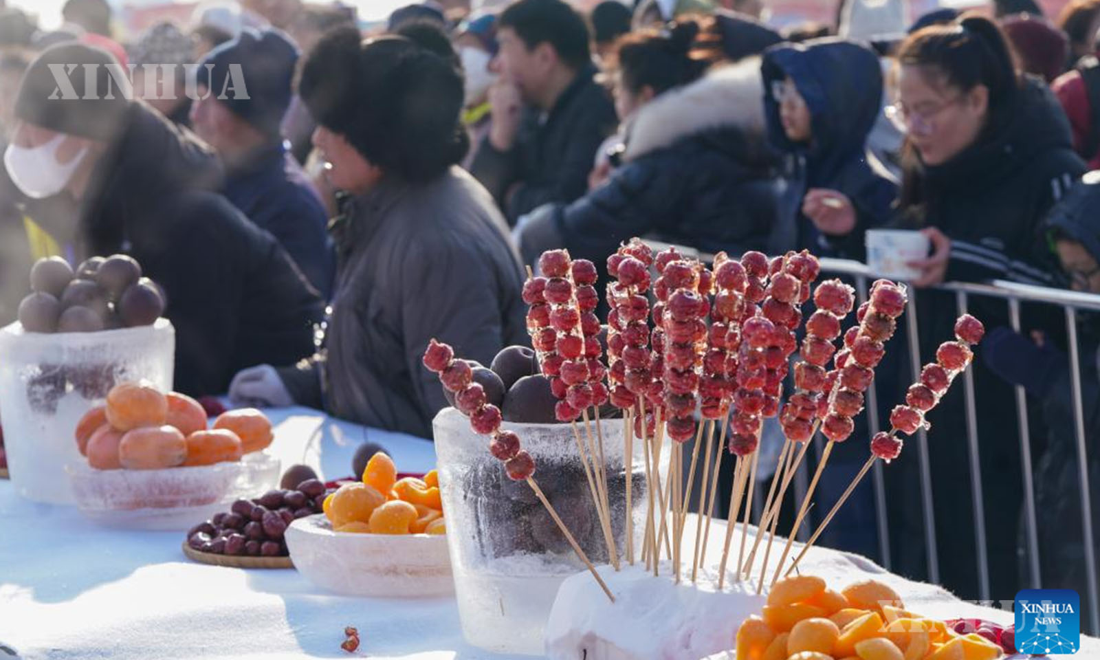 တရုတ်နိုင်ငံ အရှေ့မြောက်ပိုင်း ဟေးလုံကျန်းပြည်နယ် ဟားအယ်ပင်းမြို့၌ ကျင်းပသည့် ရေခဲစုဆောင်းမှုပွဲတော်၌ အစားအစာများအား မြည်းစမ်းနေကြသူများကို ၂၀၂၅ ခုနှစ် ဒီဇင်ဘာ ၇ ရက်က တွေ့ရစဉ် (ဆင်ဟွာ)
