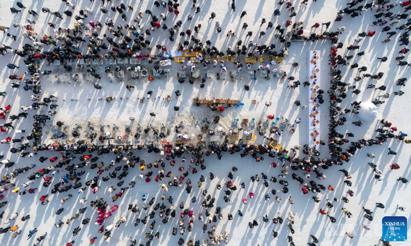 An aerial drone photo taken on Dec. 7, 2025 shows people tasting food at an ice collecting festival in Harbin, northeast China’s Heilongjiang Province. (Xinhua/Zhang Tao)