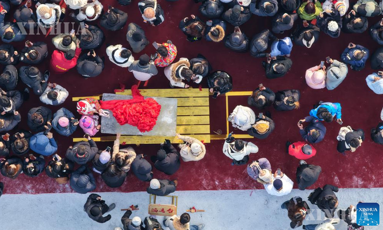 An aerial drone photo shows people viewing the first ice cube collected during an ice collecting festival in Harbin, northeast China’s Heilongjiang Province, Dec. 7, 2025. (Xinhua/Wang Song)