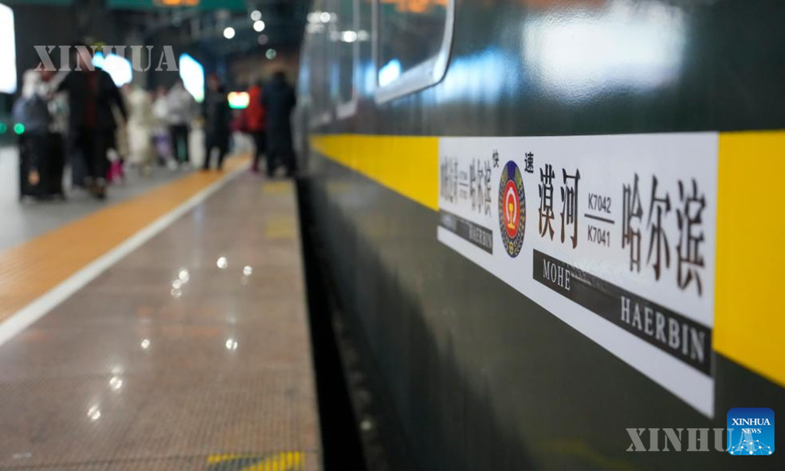 HARBIN, Dec. 23 (Xinhua) — Train K7041, the first northeast folk culture-themed train operated this winter, departed from Harbin Railway Station and headed for Mohe City on Monday.