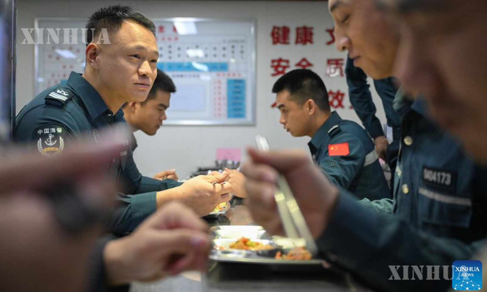 Law enforcers have a meal on the China Coast Guard (CCG) vessel Huangyan during a patrol mission in the territorial waters of China’s Huangyan Dao, Nov. 26, 2025. (Xinhua/Bei He)