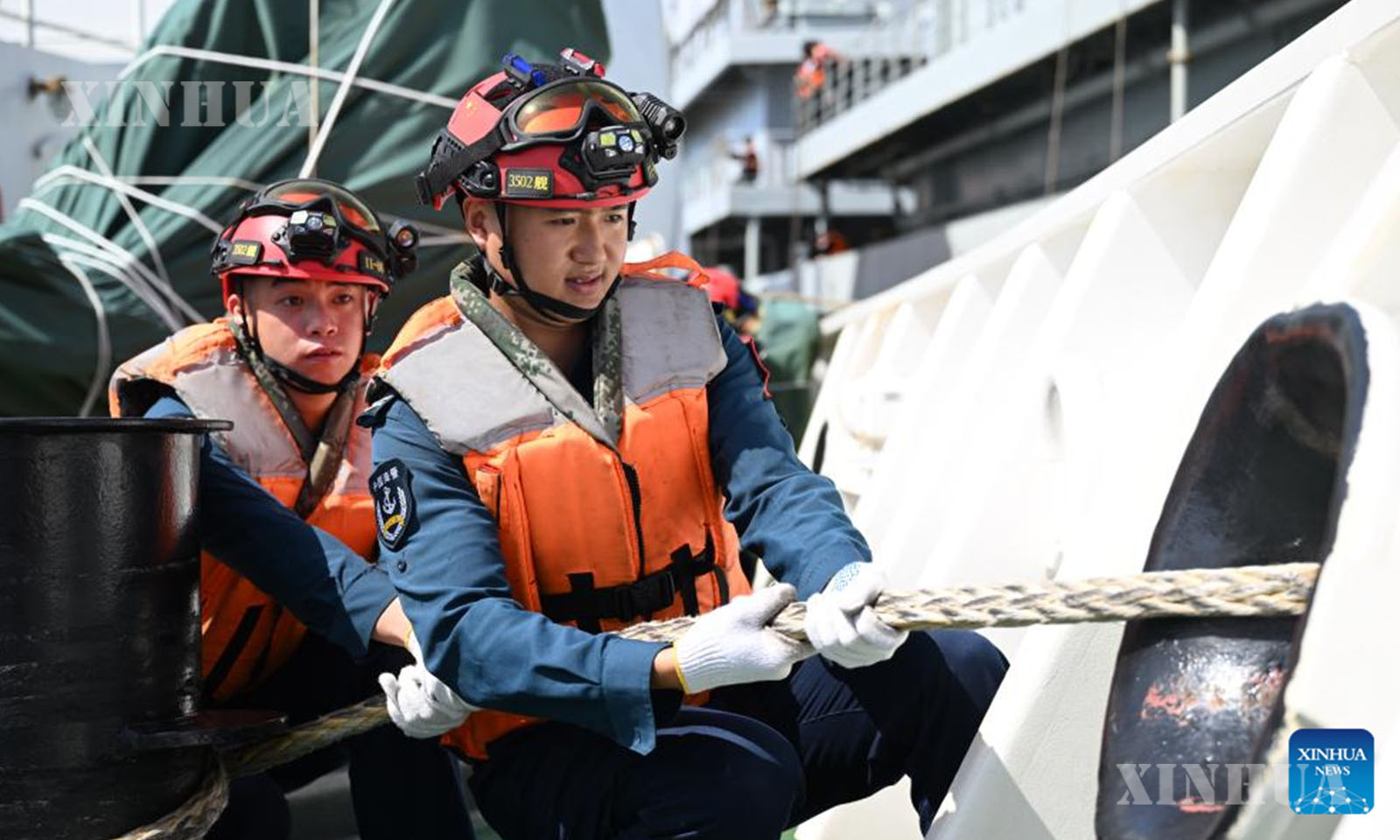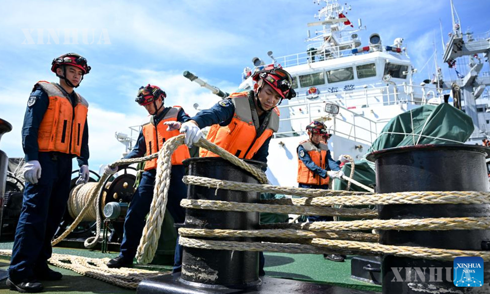 တရုတ်နိုင်ငံ၏ ဟွမ်ရန်သောင်ကျွန်း ပိုင်နက်ရေပြင်တွင် ကင်းလှည့်မစ်ရှင်တစ်ခုအတွင်း တရုတ်ကမ်းခြေစောင့်တပ်ဖွဲ့ (CCG) ရေယာဉ် ဟွမ်ရန်ပေါ်၌ အစားအစာစားသုံးနေသည့် ဥပဒေစိုးမိုးရေးတာဝန်ရှိသူများကို ၂၀၂၅ ခုနှစ် နိုဝင်ဘာ ၂၆ ရက်က တွေ့ရစဉ် (ဆင်ဟွာ)