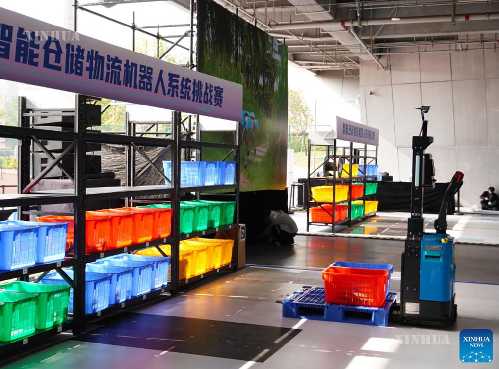 This photo shows a competition of intelligent warehouse logistics robot system during a robot skills competition in Shenzhen, south China’s Guangdong Province, Dec. 27, 2025. (Xinhua/Wang Feng)